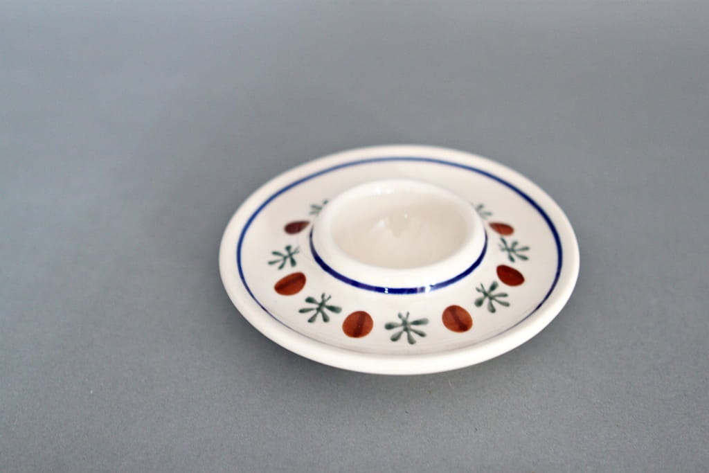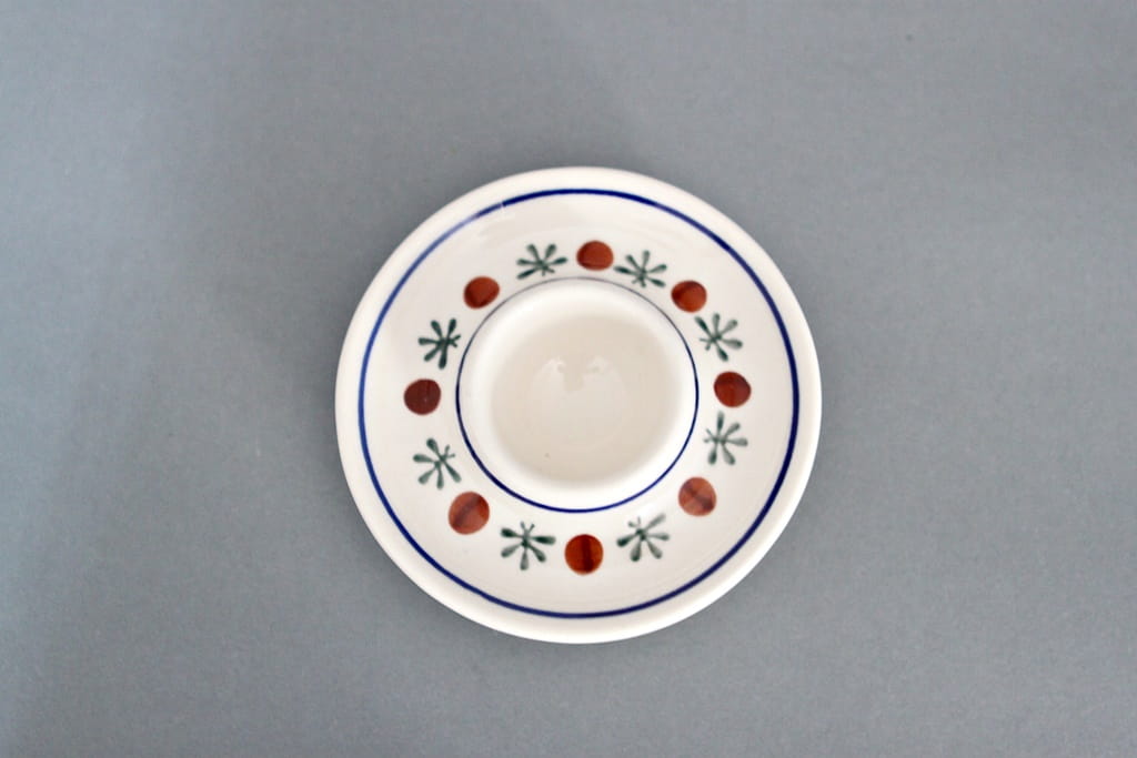 Płaski jajecznik, malowany ręcznie. Chroni przed oparzeniem się podczas jedzenia. Jest praktycznym rozwiązaniem przy podawaniu jajek na miękko lub twardo. Szkliwienie sprawia, że naczynia są bardziej odporne na zabrudzenia, mają niska absorpcję wody i są łatwiejsze w czyszczeniu.