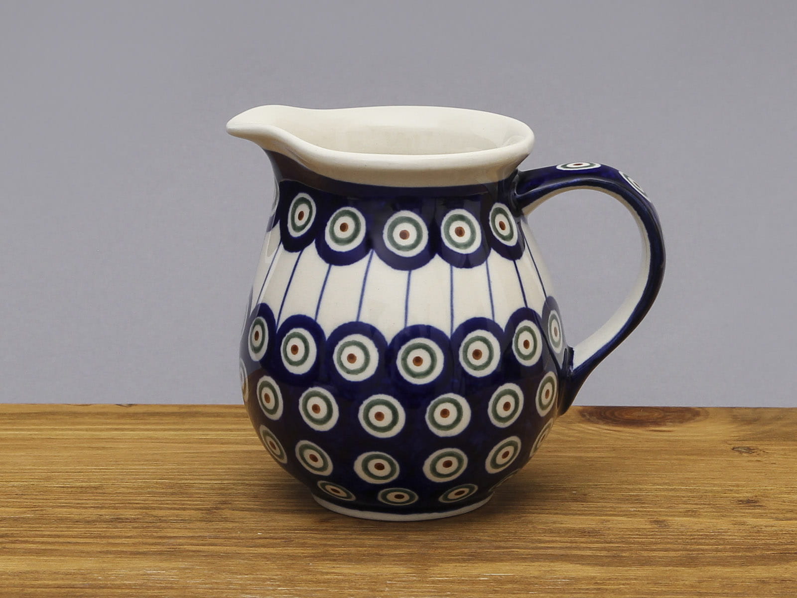 Dzbanek o pojemności 420 ml, malowany ręcznie. Wyprofilowany dzióbek usprawnia nalewanie oraz zapobiega spływaniu płynu po zewnętrznej ściance naczynia. Praktyczny uchwyt ułatwia użycie. Oprócz swojej podstawowej funkcji może pełnić rolę wazonu lub dekoracyjną. Szkliwienie sprawia, że naczynia są bardziej odporne na zabrudzenia, mają niska absorpcję wody i są łatwiejsze w czyszczeniu.