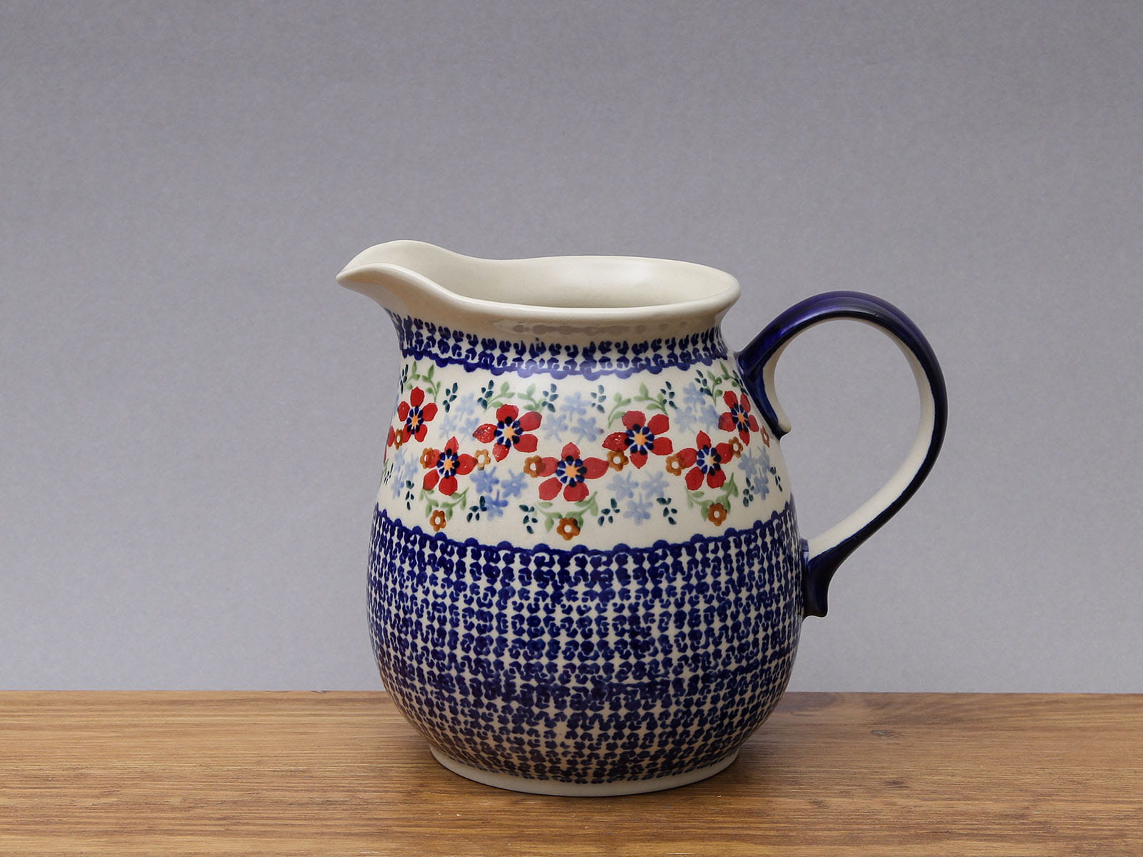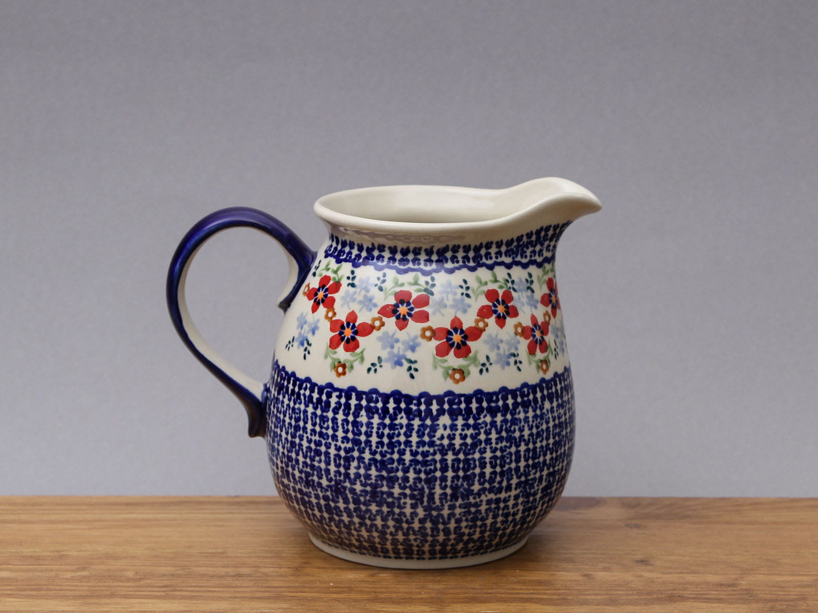 Dzbanek z uchem, malowany ręcznie. Wyprofilowany dzióbek ułatwia nalewanie. Może służyć do podwanaia napoi ciepłych lub zimnych, a także do przechowywania cieczy. Szkliwienie sprawia, że naczynia są bardziej odporne na zabrudzenia, mają niską absorpcję wody i są łatwiejsze w czyszczeniu.