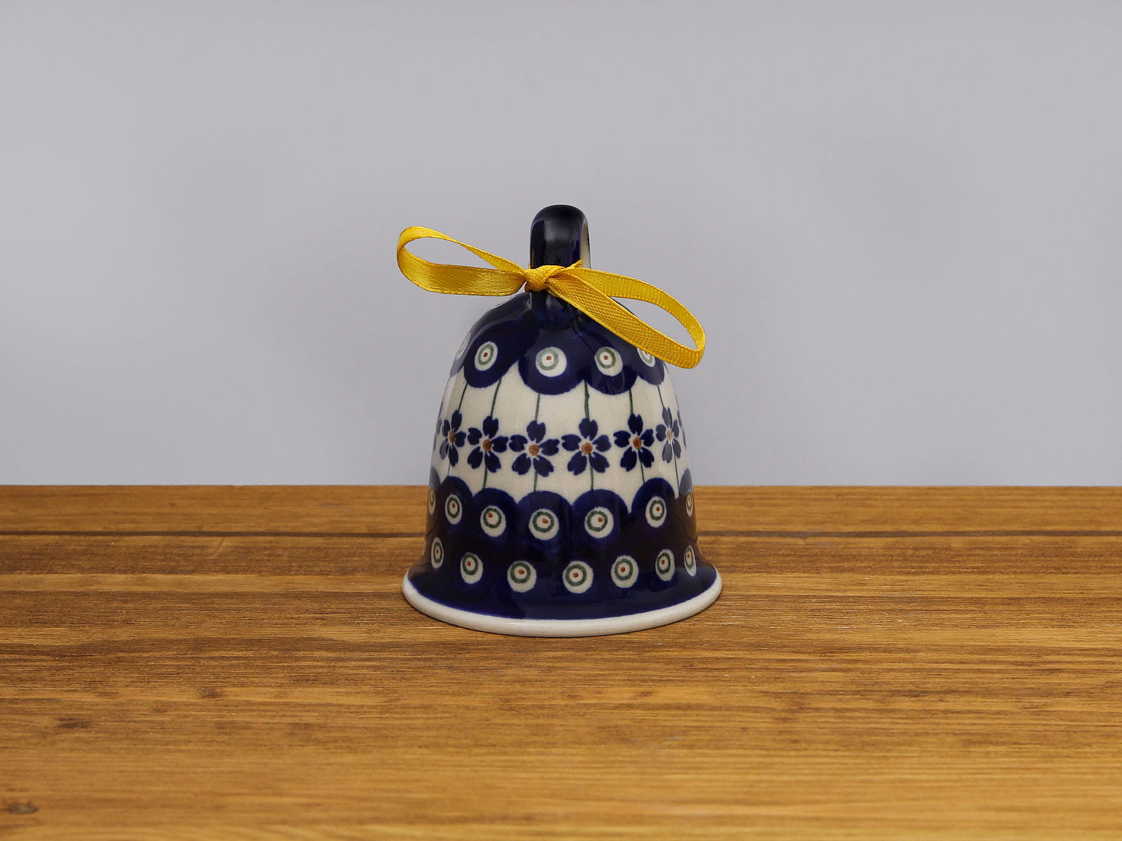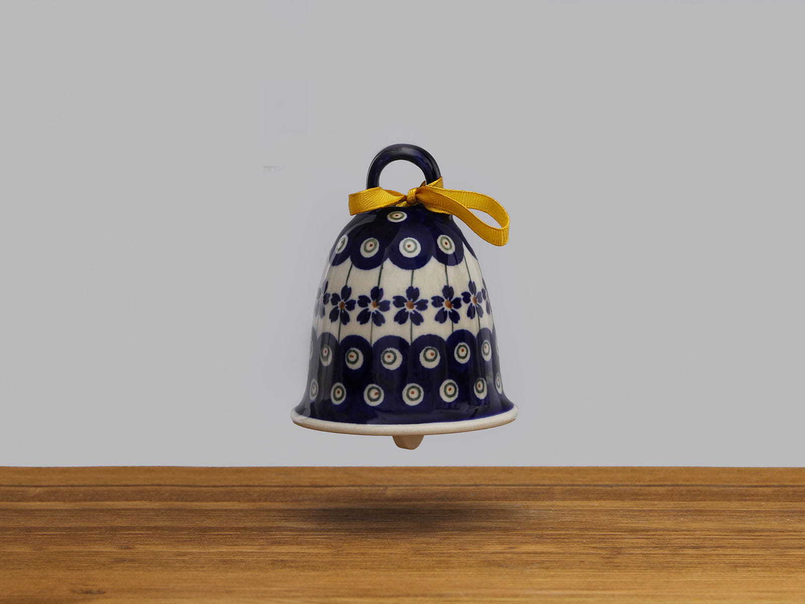 Dzwonek o wysokości 10 cm, malowany ręcznie. Serce dzwonka przywiązane jest wstążką, która tworzy dekoracyjną kokardę na uchwycie. Dzięki uchwytowi dzwonek może być wykorzystany jako ozdoba choinkowa czy element stroika. Równie dobrze prezentuje się jako ozdoba stołu. Szkliwienie sprawia, że naczynia są bardziej odporne na zabrudzenia, mają niską absorpcję wody i są łatwiejsze w czyszczeniu.