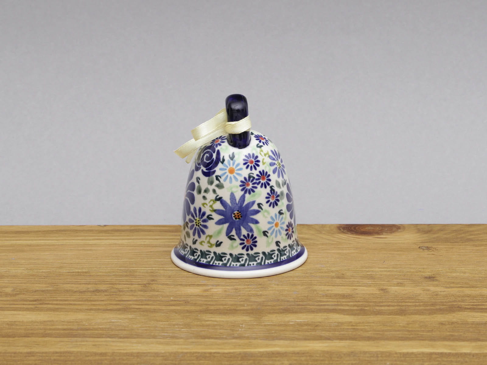 Dzwonek o wysokości 10 cm, malowany ręcznie. Serce dzwonka przywiązane jest wstążką, która tworzy dekoracyjną kokardę na uchwycie. Dzięki uchwytowi dzwonek może być wykorzystany jako ozdoba choinkowa czy element stroika. Równie dobrze prezentuje się jako ozdoba stołu. Szkliwienie sprawia, że naczynia są bardziej odporne na zabrudzenia, mają niską absorpcję wody i są łatwiejsze w czyszczeniu