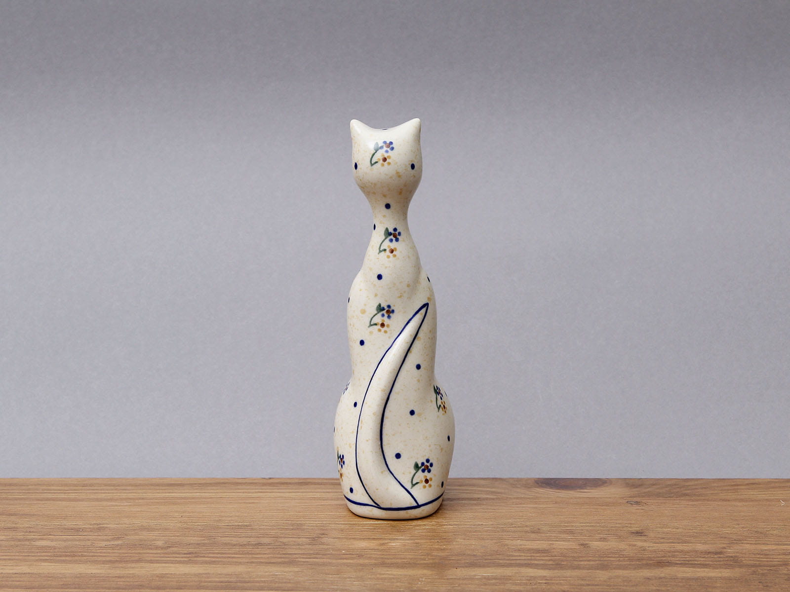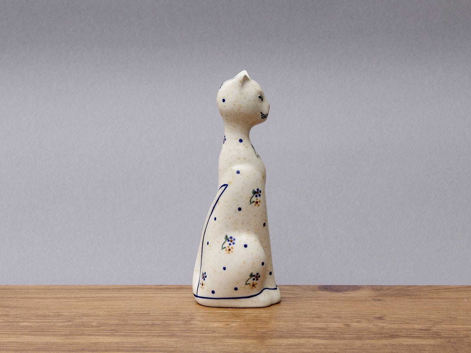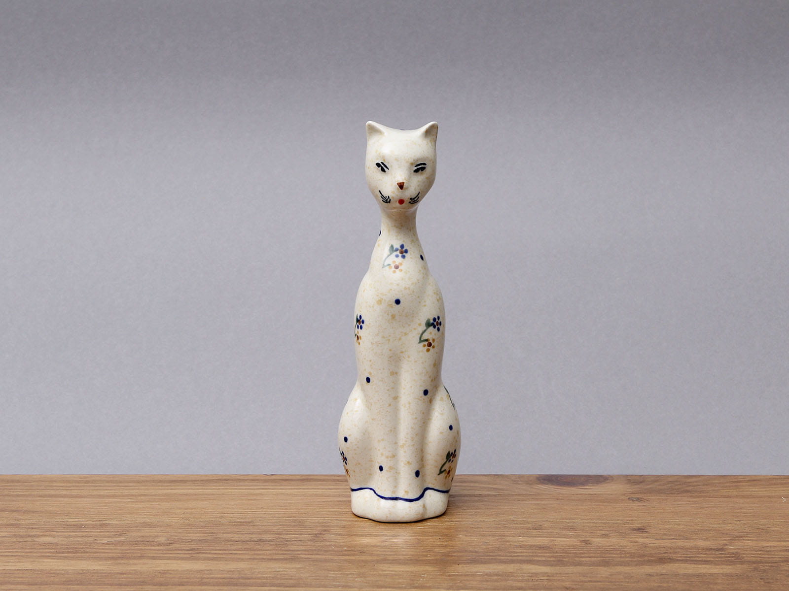 Figurka w kształcie kota, malowana ręcznie. Ozdobny element odpowiedni do każdej przestrzeni. Sprawdzi się również jako prezent. Kot jest symbolem niezależności, czystości, macierzyństwa, swobody, długowieczności, domatorstwa, wygody, elegancji i wdzięku. Często postrzegany jako samolubne stworzenie, przez co stał się mało lubiany, jednak gdy trafisz na swojego, właściwego kota przekonasz się jaki może być oddany, inteligentny i kochający. Szkliwienie sprawia, że produkty są bardziej odporne na zabrudzenia, mają niską absorpcję wody i są łatwiejsze w czyszczeniu.