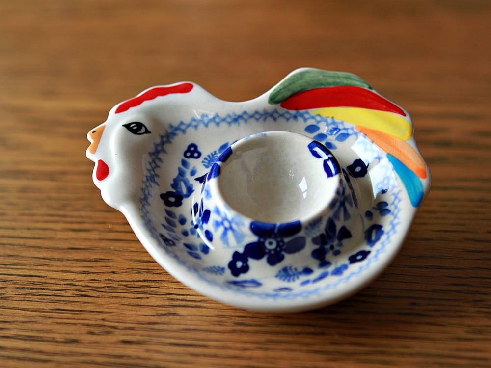 Jajecznik w podstawce, malowany ręcznie, w formie kurki. Praktyczny dodatek, który ułatwia jedzenie jaj na miękko, chroniąc nas przed poparzeniem się. Ma formę podstawka z wgłębieniem, co jest praktycznym rozwiązaniem, gdy zastanawiamy się gdzie odłożyć brudną łyżeczkę oraz nie musimy szukać dodatkowego naczynia na skorupki. Szkliwienie sprawia, że naczynia są bardziej odporne na zabrudzenia, mają niską absorpcję wody i są łatwiejsze w czyszczeniu.