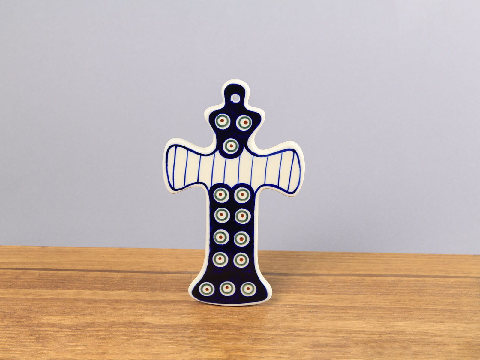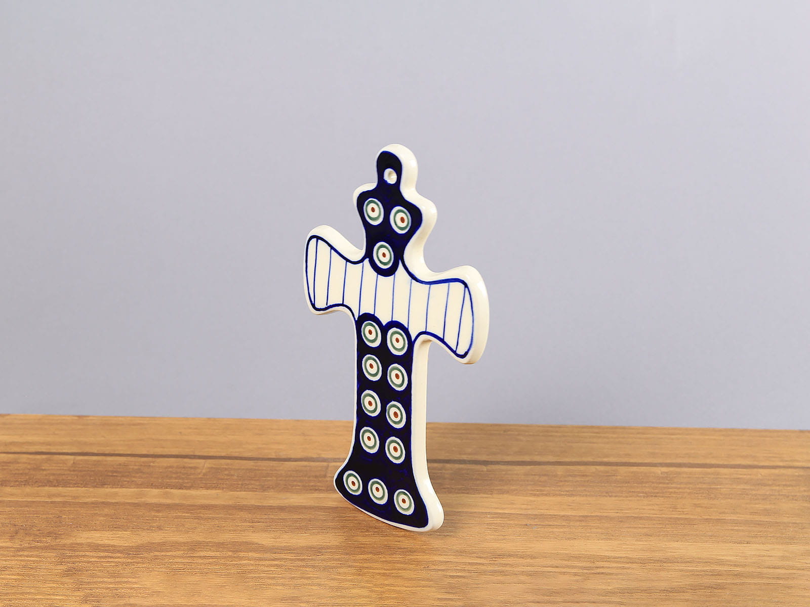 Krzyż z zawieszką, malowany ręcznie. Artykuł dekoracyjny. Szkliwienie sprawia, że naczynia są bardziej odporne na zabrudzenia, mają niską absorpcję wody i są łatwiejsze w czyszczeniu.