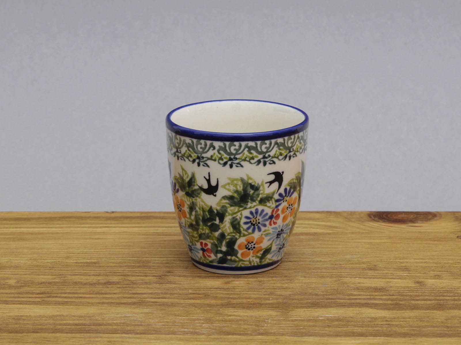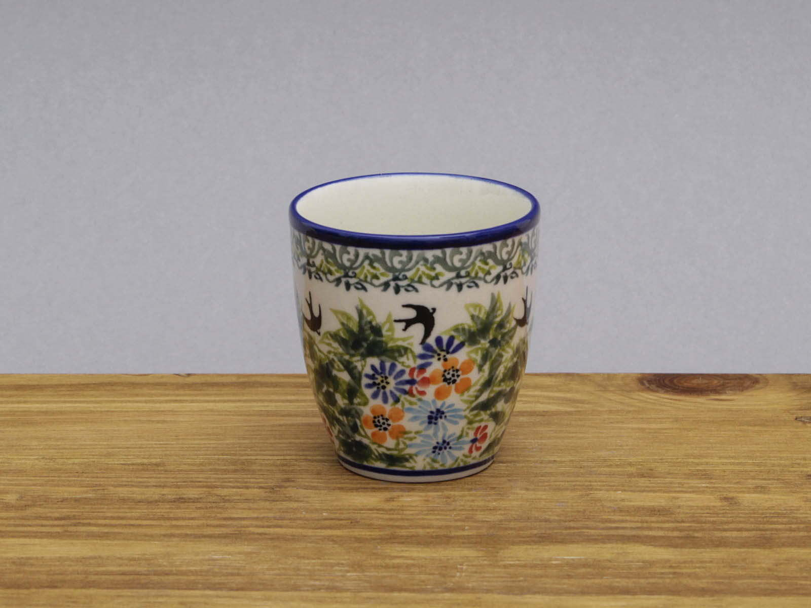 Kubek o pojemności 180 ml, malowany ręcznie. Naczynie do podawania ciepłych i zimnych napojów. Dzięki termoizolacyjnym właściwościom ceramiki zawartość dłużej utrzymuje ciepło. Szkliwienie sprawia, że naczynia są bardziej odporne na zabrudzenia, mają niska absorpcję wody i są łatwiejsze w czyszczeniu.