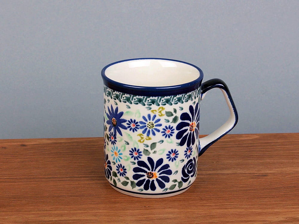 Kubek o pojemności 250 ml, malowany ręcznie. Naczynie do podawania ciepłych i zimnych napojów. Wybierany jako część zestawu śniadaniowego lub samodzielny prezent. Dzięki termoizolacyjnym właściwościom ceramiki zawartość dłużej utrzymuje ciepło. Szkliwienie sprawia, że naczynia są bardziej odporne na zabrudzenia, mają niska absorpcję wody i są łatwiejsze w czyszczeniu.
