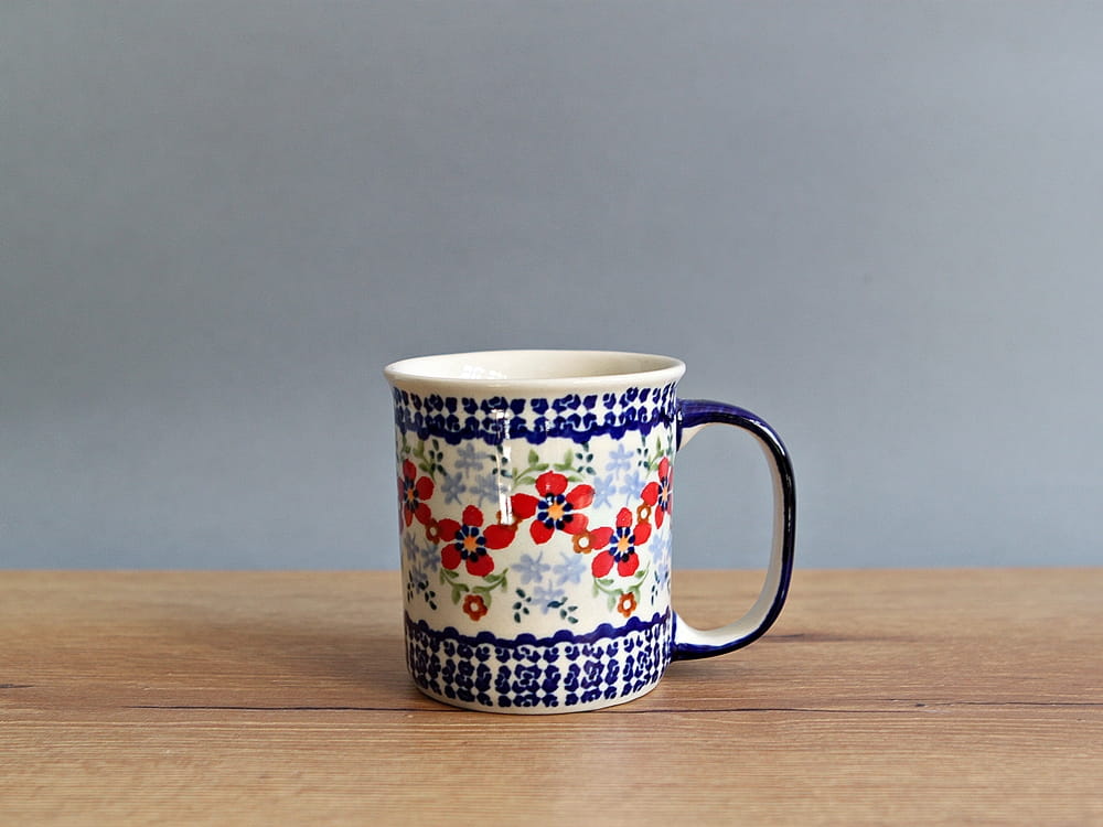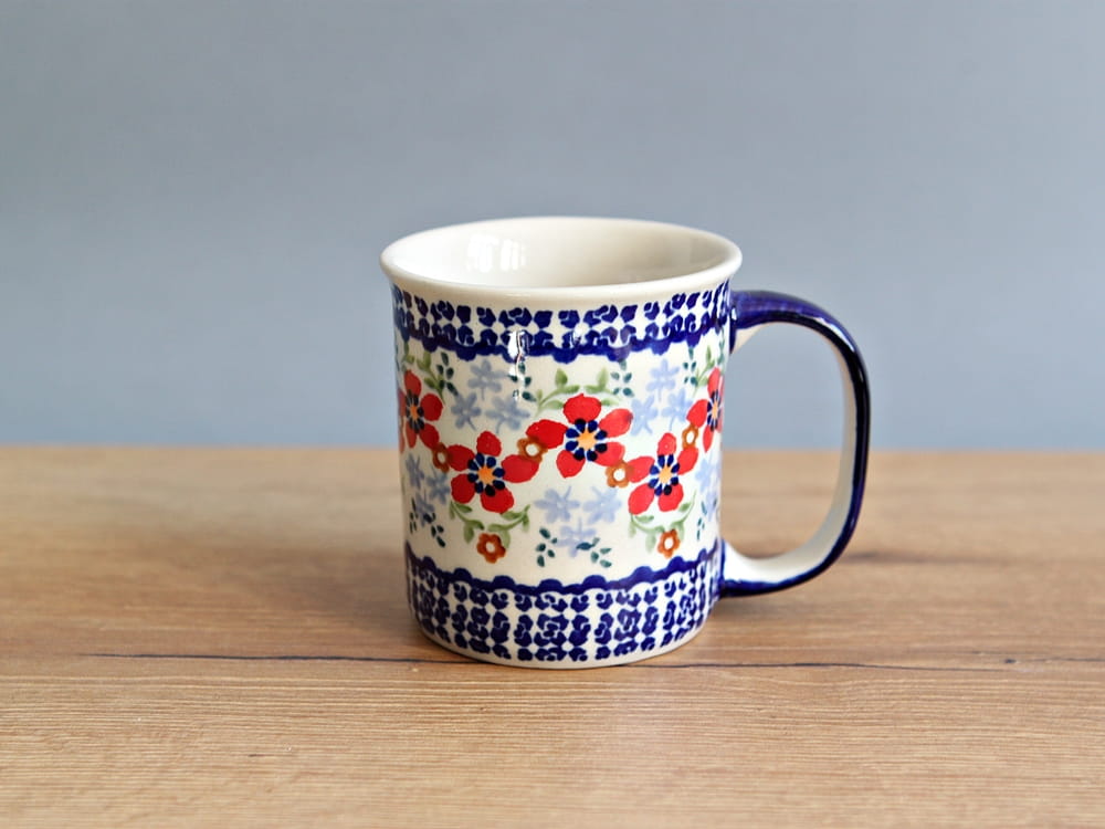 Kubek o pojemności 300 ml, malowany ręcznie. Naczynie do podawania ciepłych i zimnych napojów. Dzięki termoizolacyjnym właściwościom ceramiki zawartość dłużej utrzymuje ciepło. Szkliwienie sprawia, że naczynia są bardziej odporne na zabrudzenia, mają niska absorpcję wody i są łatwiejsze w czyszczeniu.
