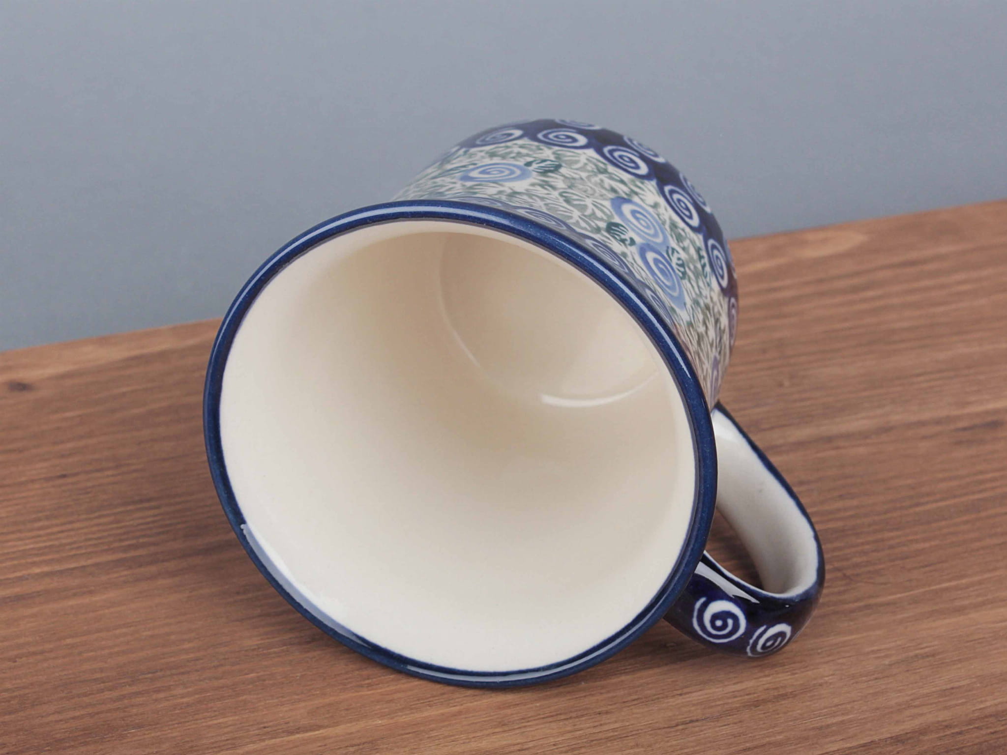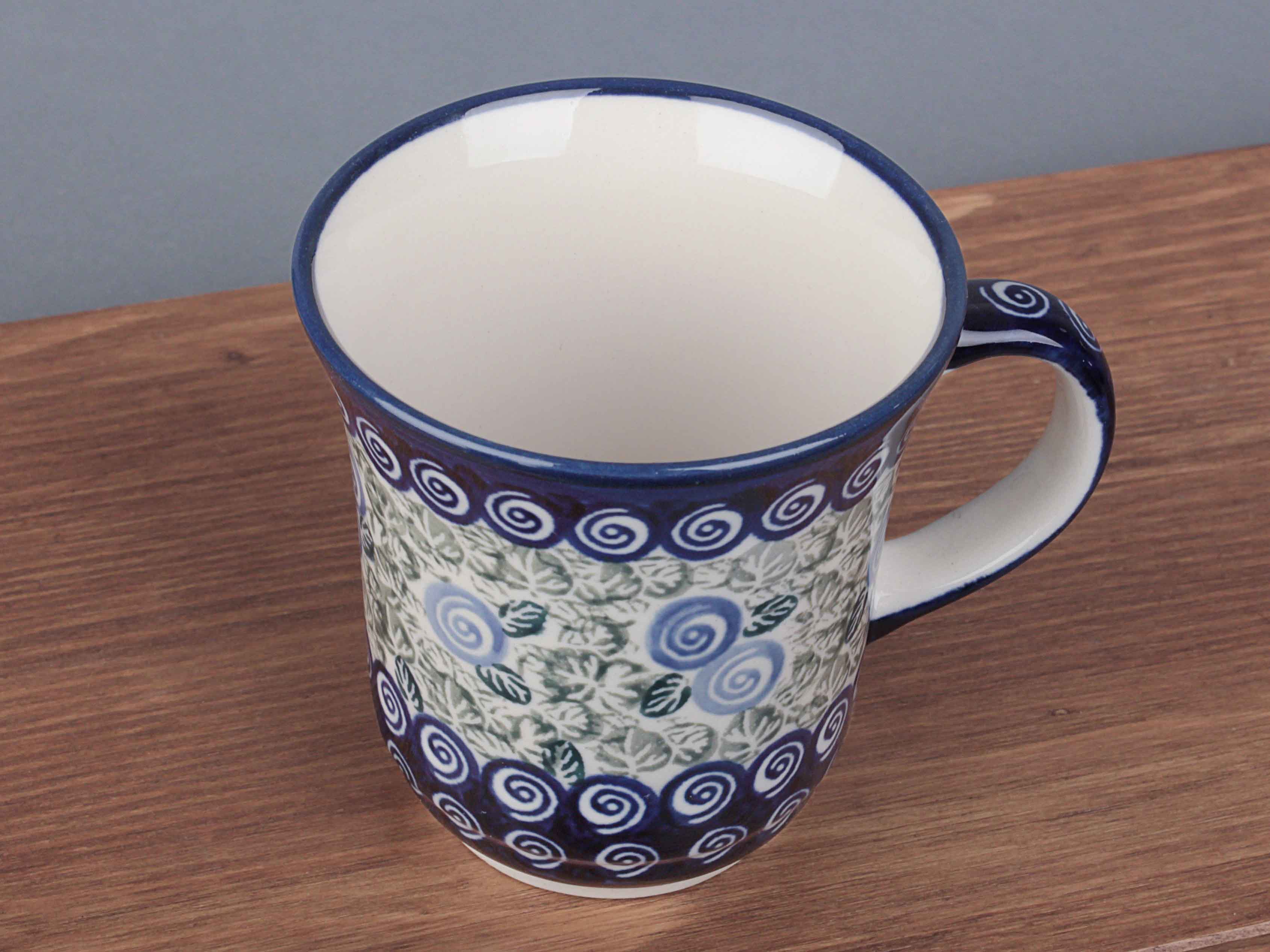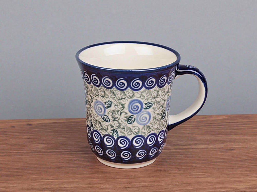 Kubek o pojemności 300 ml, malowany ręcznie. Naczynie do podawania ciepłych i zimnych napojów. Wybierany jako część zestawu śniadaniowego lub samodzielny prezent. Dzięki termoizolacyjnym właściwościom ceramiki zawartość dłużej utrzymuje ciepło. Szkliwienie sprawia, że naczynia są bardziej odporne na zabrudzenia, mają niska absorpcję wody i są łatwiejsze w czyszczeniu.