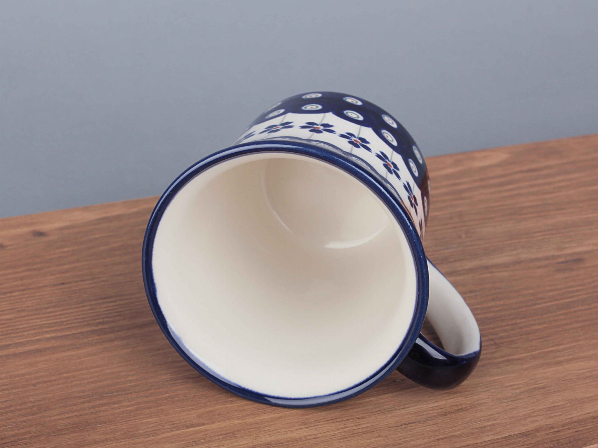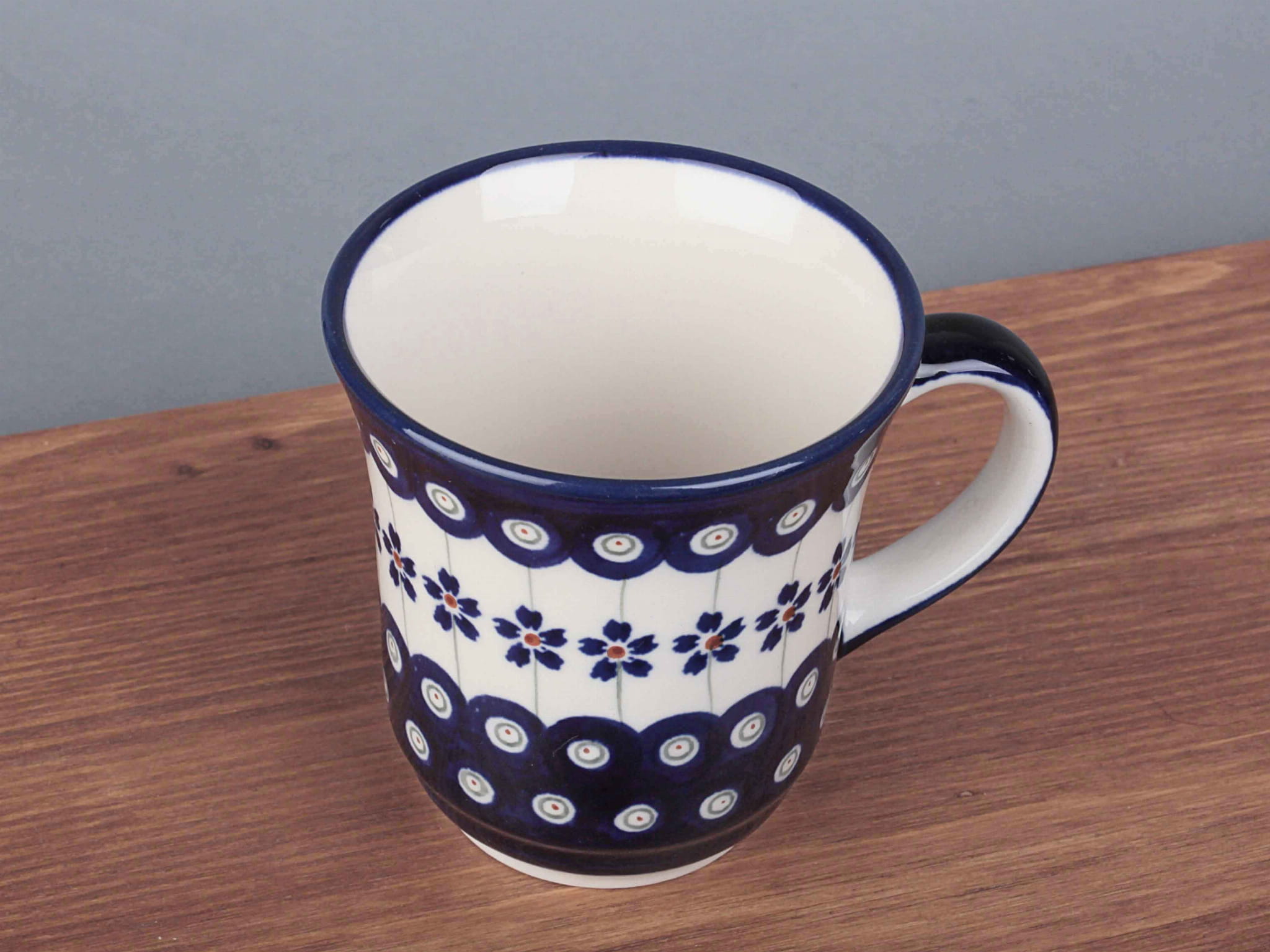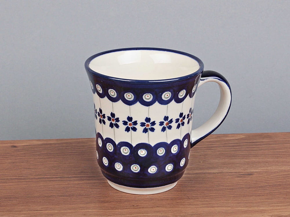 Kubek o pojemności 300 ml, malowany ręcznie. Naczynie do podawania ciepłych i zimnych napojów. Wybierany jako część zestawu śniadaniowego lub samodzielny prezent. Dzięki termoizolacyjnym właściwościom ceramiki zawartość dłużej utrzymuje ciepło. Szkliwienie sprawia, że naczynia są bardziej odporne na zabrudzenia, mają niska absorpcję wody i są łatwiejsze w czyszczeniu.