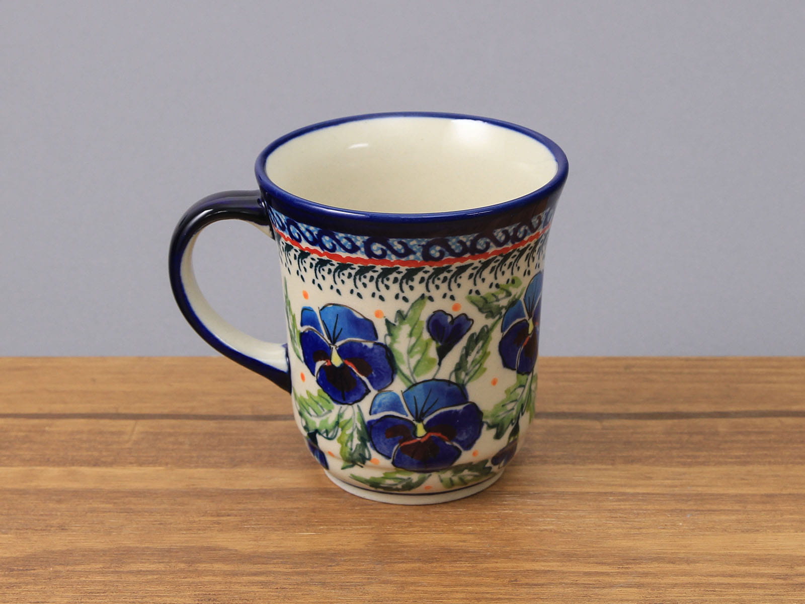 Kubek o pojemności 300 ml, malowany ręcznie. Naczynie do podawania ciepłych i zimnych napojów. Wybierany jako część zestawu śniadaniowego lub samodzielny prezent. Dzięki termoizolacyjnym właściwościom ceramiki zawartość dłużej utrzymuje ciepło. Szkliwienie sprawia, że naczynia są bardziej odporne na zabrudzenia, mają niska absorpcję wody i są łatwiejsze w czyszczeniu.
