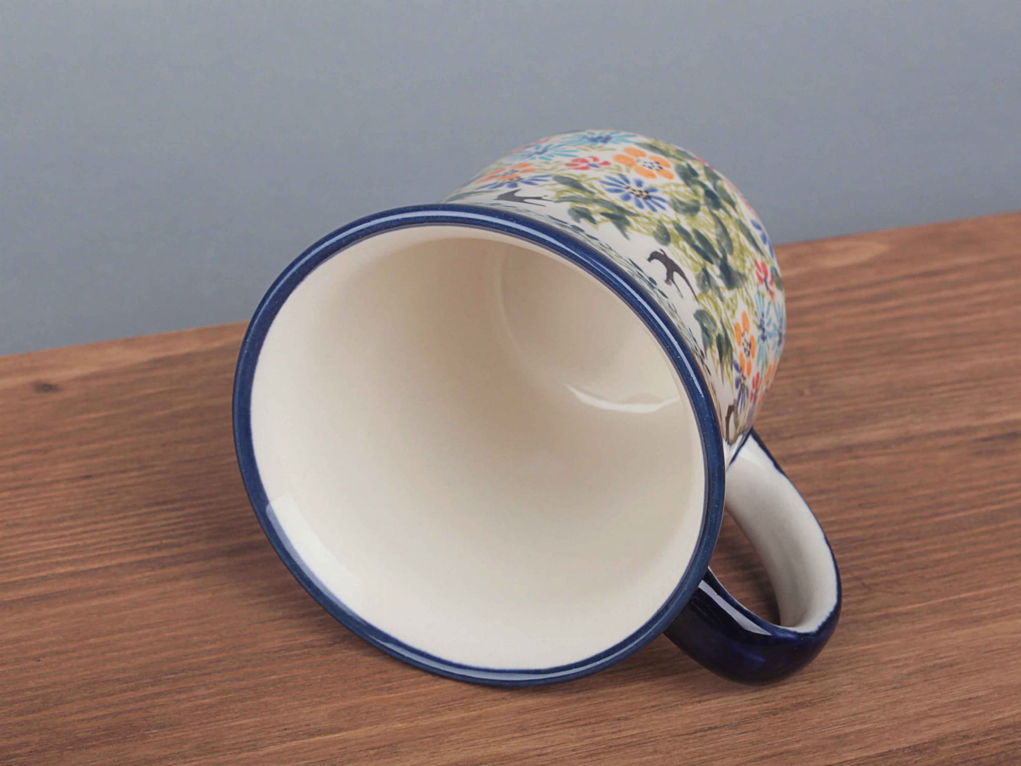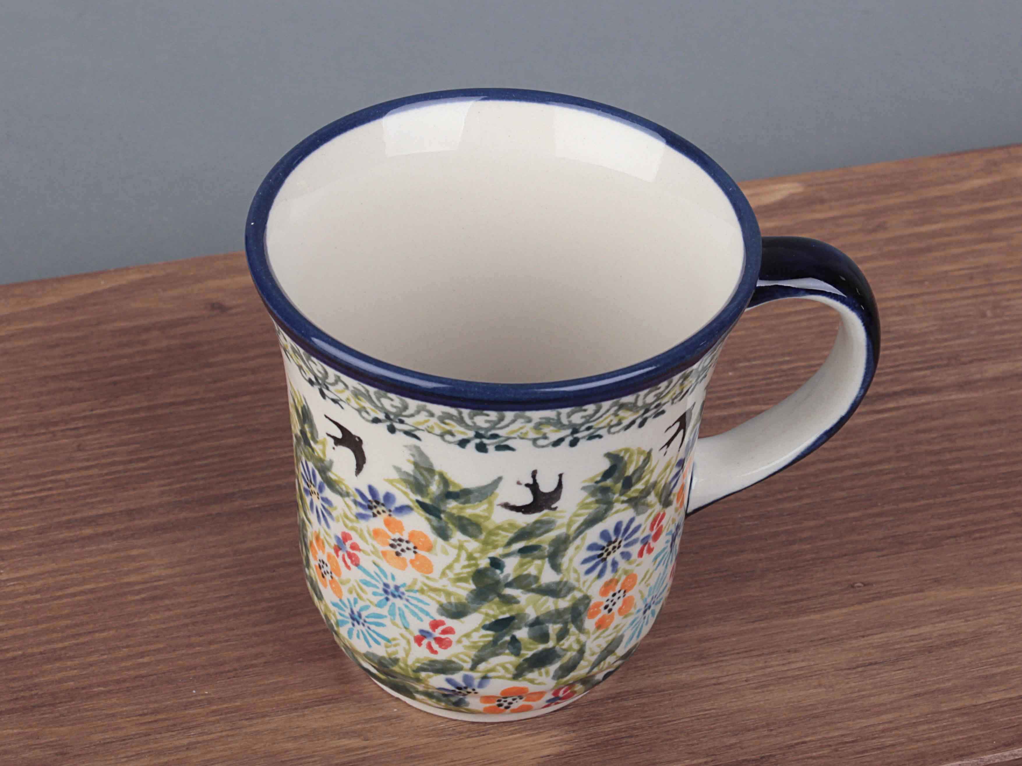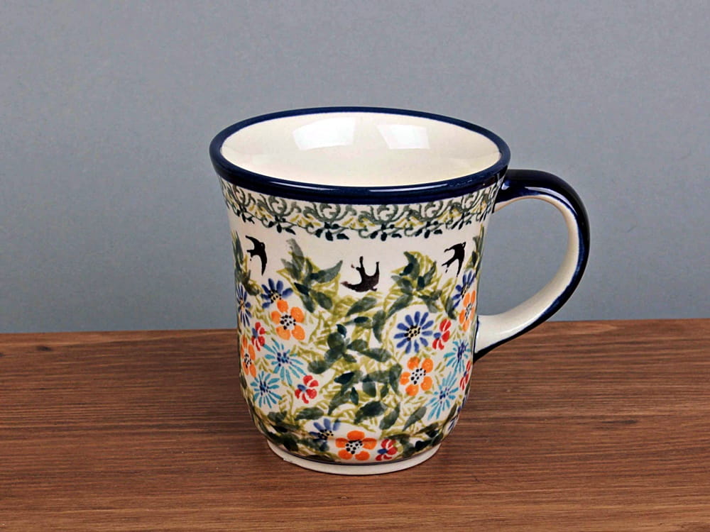 Kubek o pojemności 300 ml, malowany ręcznie. Naczynie do podawania ciepłych i zimnych napojów. Wybierany jako część zestawu śniadaniowego lub samodzielny prezent. Dzięki termoizolacyjnym właściwościom ceramiki zawartość dłużej utrzymuje ciepło. Szkliwienie sprawia, że naczynia są bardziej odporne na zabrudzenia, mają niska absorpcję wody i są łatwiejsze w czyszczeniu.