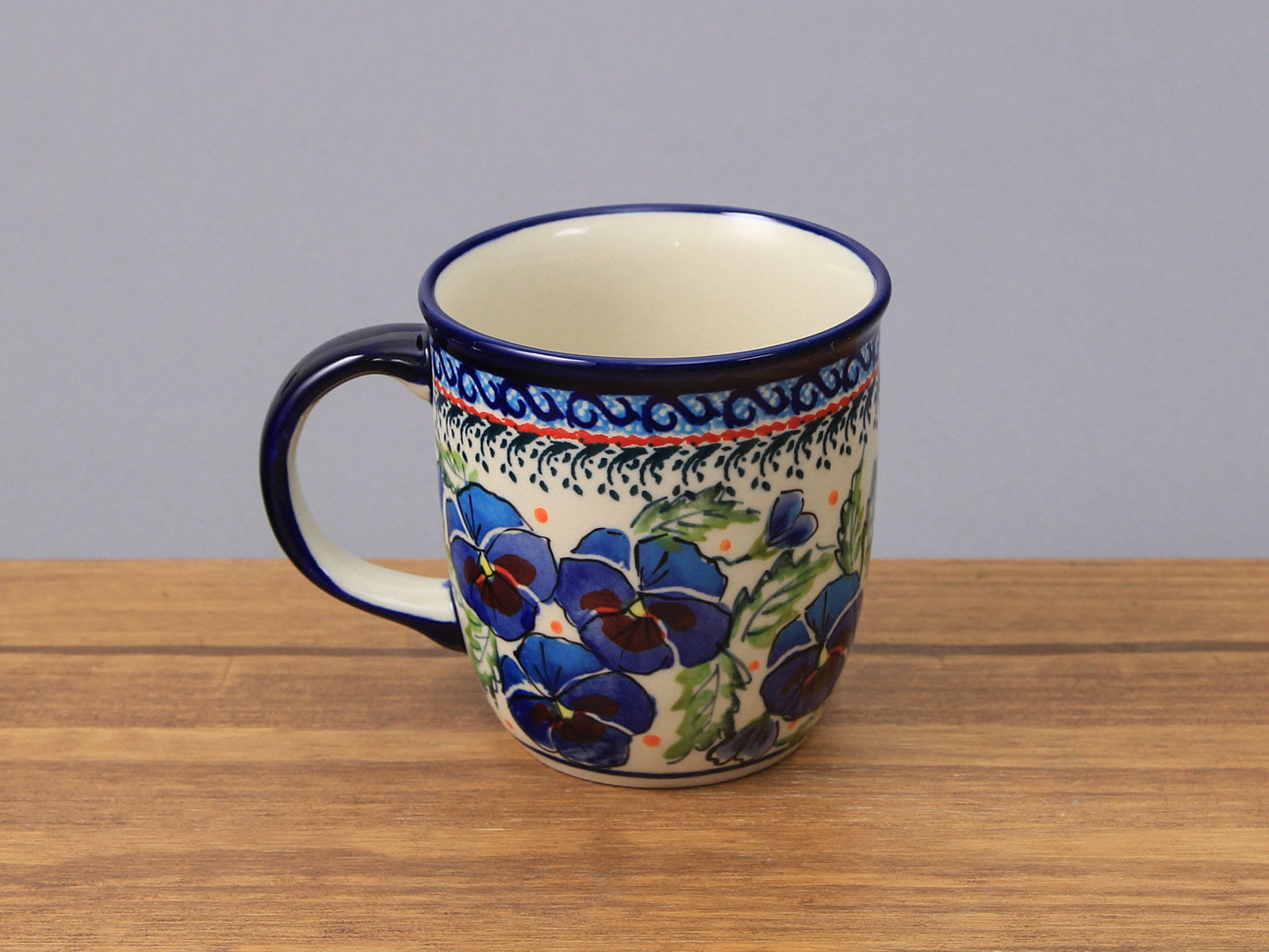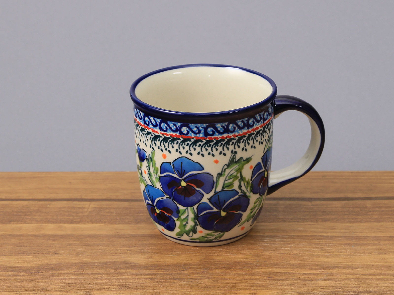 Kubek o pojemności 350 ml, malowany ręcznie. Naczynie do podawania ciepłych i zimnych napojów. Wybierany jako część zestawu śniadaniowego lub samodzielny prezent. Dzięki termoizolacyjnym właściwościom ceramiki zawartość dłużej utrzymuje ciepło. Szkliwienie sprawia, że naczynia są bardziej odporne na zabrudzenia, mają niska absorpcję wody i są łatwiejsze w czyszczeniu.