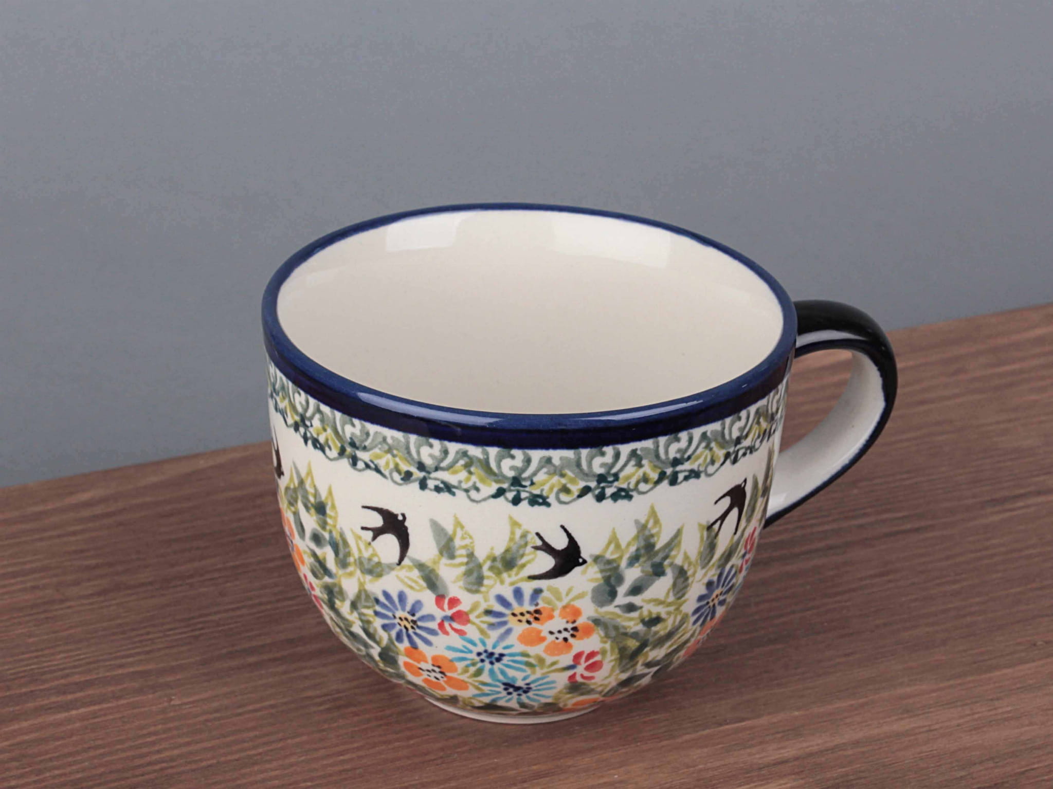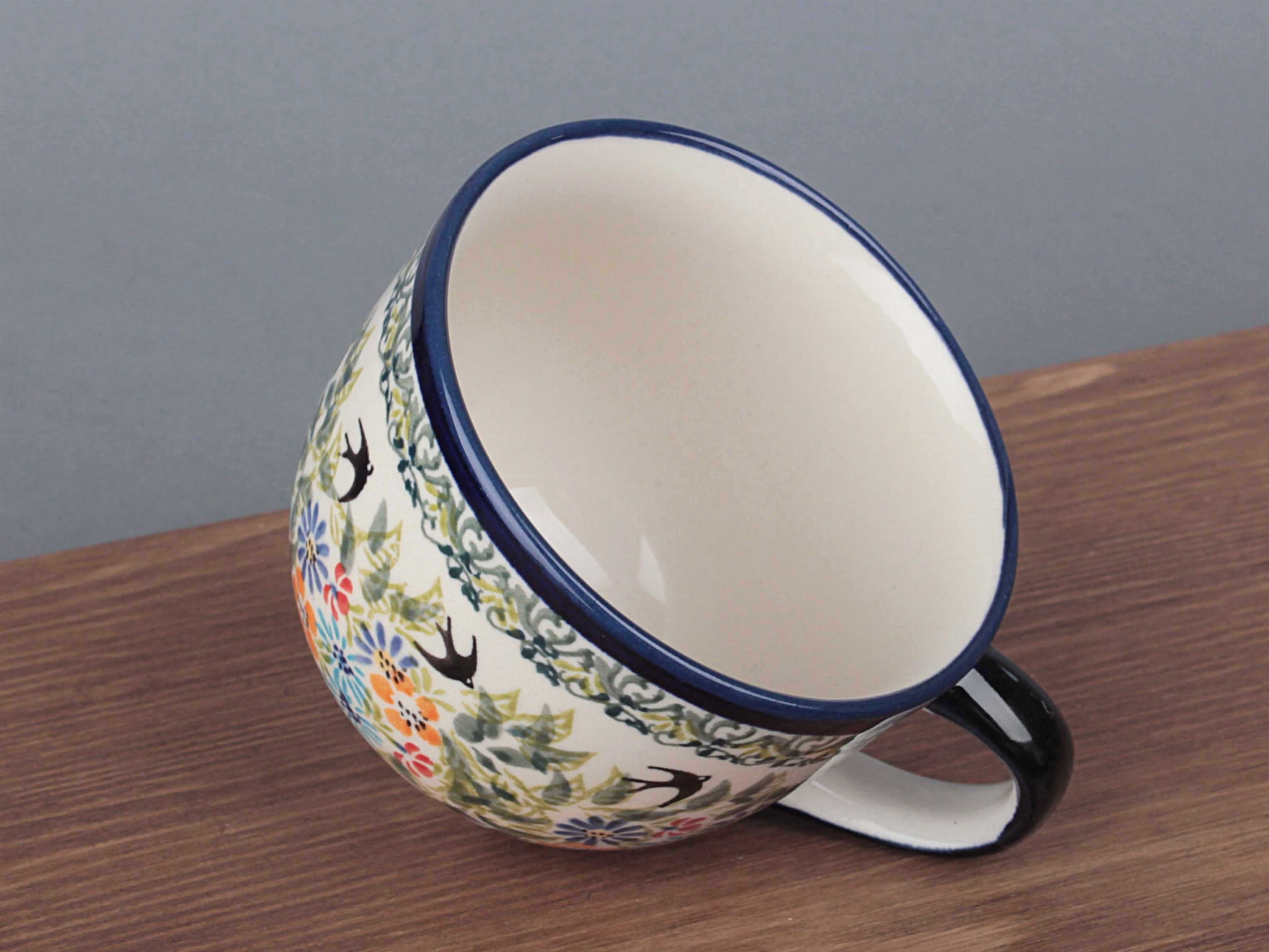 Kubek o pojemności 350 ml, malowany ręcznie. Naczynie do podawania ciepłych i zimnych napojów, wybierane jako osobny prezeny lub do zestawów herbacianych. Dzięki termoizolacyjnym właściwościom ceramiki zawartość dłużej utrzymuje ciepło. Szkliwienie sprawia, że naczynia są bardziej odporne na zabrudzenia, mają niska absorpcję wody i są łatwiejsze w czyszczeniu.