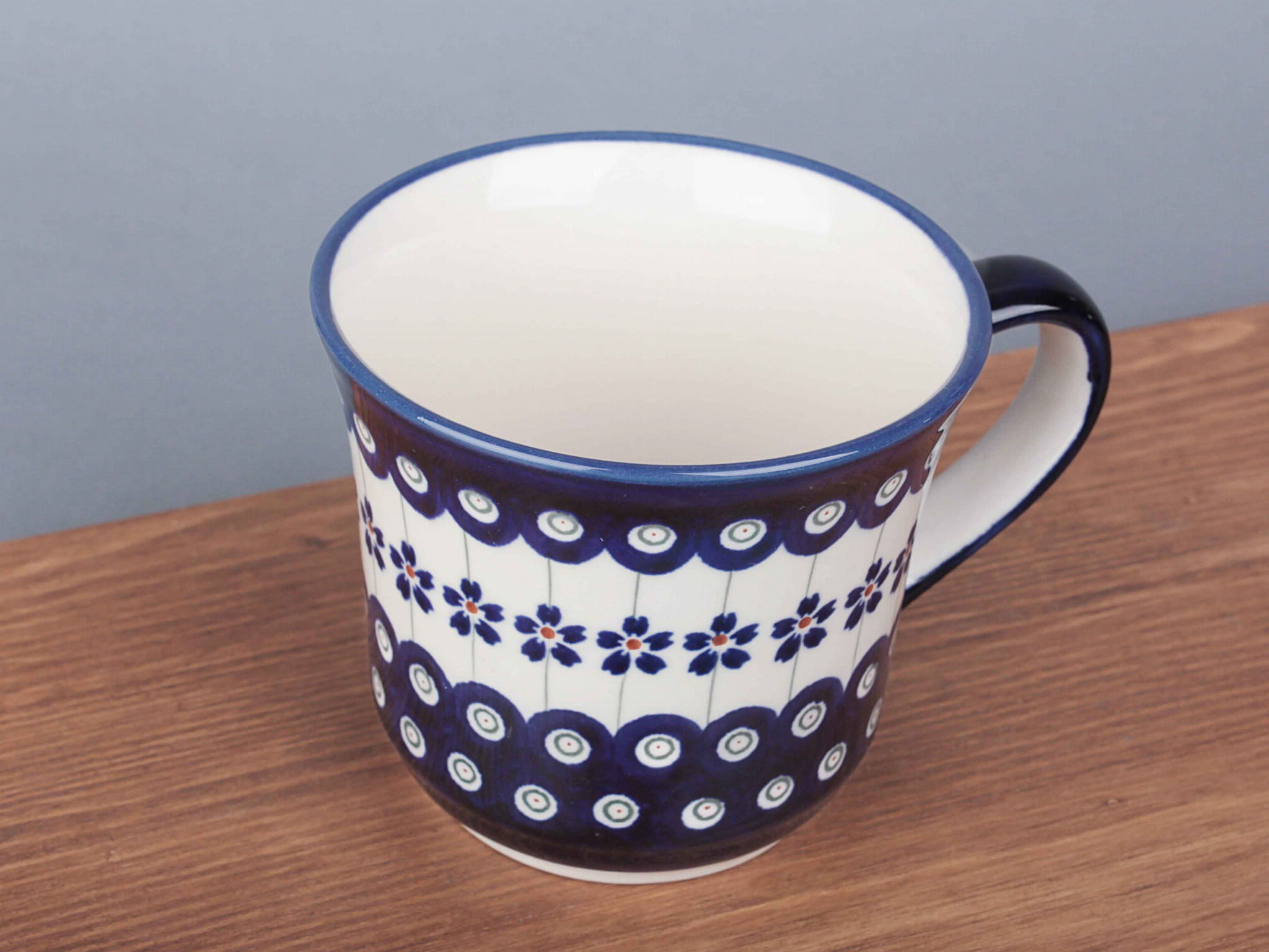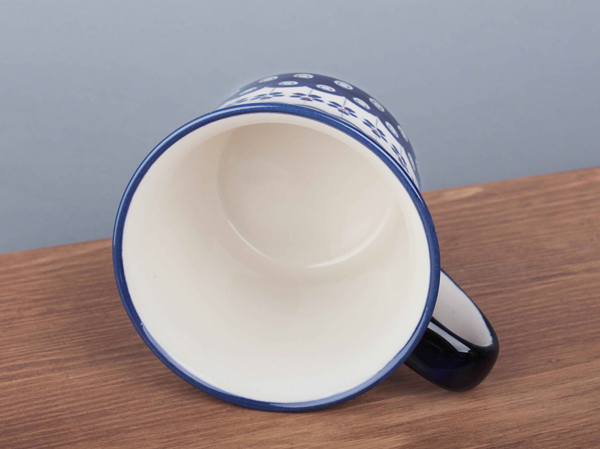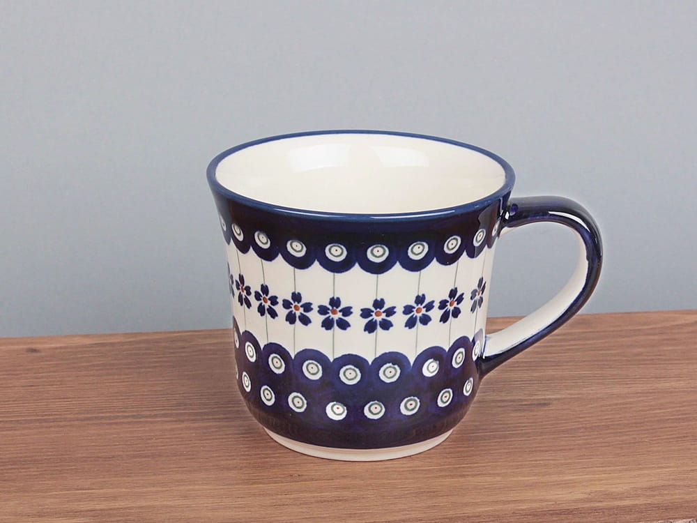 Kubek o pojemności 500 ml, malowany ręcznie. Naczynie do podawania ciepłych i zimnych napojów. Wybierany jako samodzielny prezent. Dzięki termoizolacyjnym właściwościom ceramiki zawartość dłużej utrzymuje ciepło. Szkliwienie sprawia, że naczynia są bardziej odporne na zabrudzenia, mają niska absorpcję wody i są łatwiejsze w czyszczeniu.