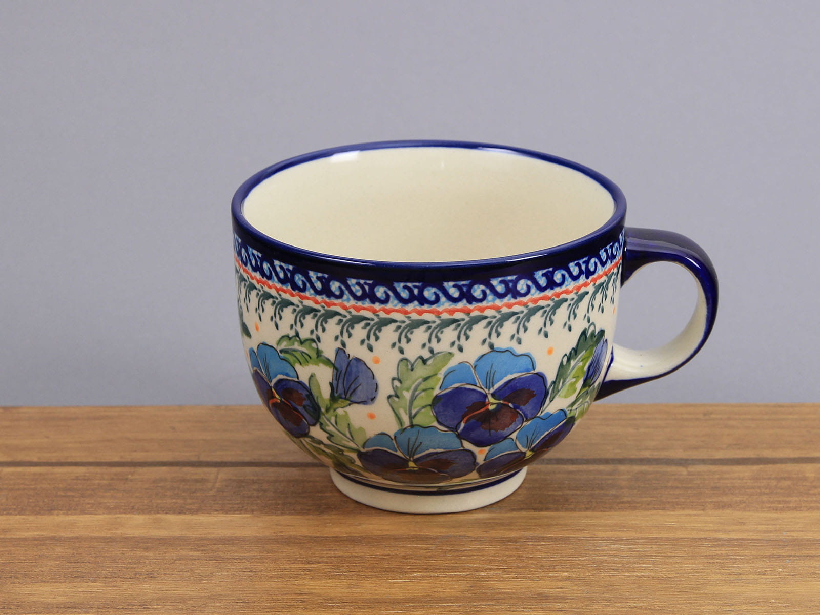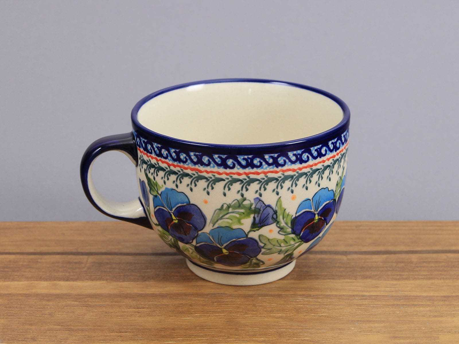 Kubek o pojemności 500 ml, malowany ręcznie. Naczynie do podawania ciepłych i zimnych napojów, kształtem nawiązuje do tradycyjnej filiżanki. Dzięki termoizolacyjnym właściwościom ceramiki zawartość dłużej utrzymuje ciepło. Szkliwienie sprawia, że naczynia są bardziej odporne na zabrudzenia, mają niska absorpcję wody i są łatwiejsze w czyszczeniu.