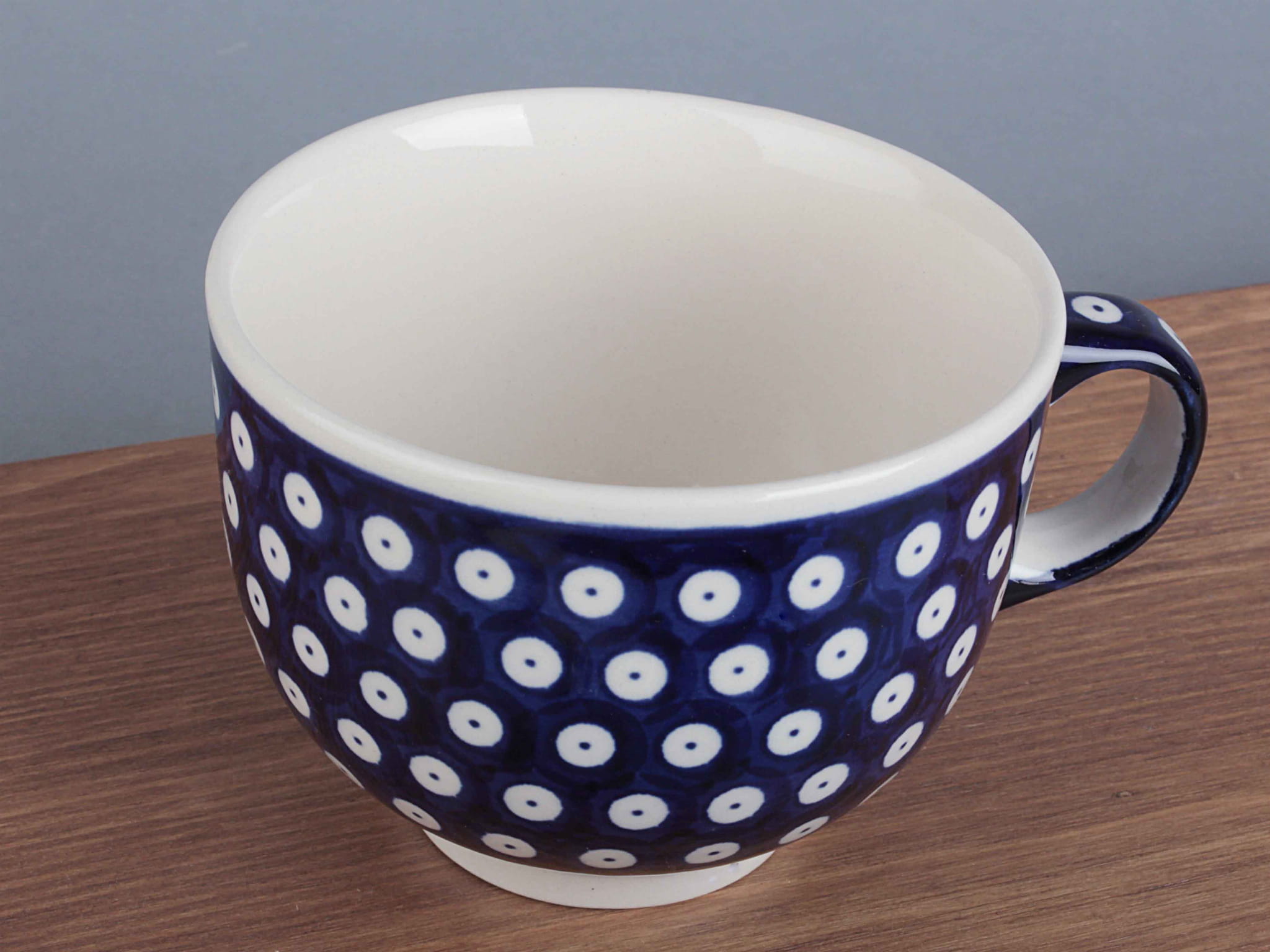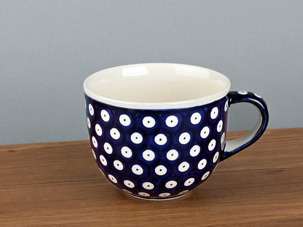 Kubek o pojemności 500 ml, malowany ręcznie. Naczynie do podawania ciepłych i zimnych napojów, kształtem nawiązuje do tradycyjnej filiżanki. Dzięki termoizolacyjnym właściwościom ceramiki zawartość dłużej utrzymuje ciepło. Szkliwienie sprawia, że naczynia są bardziej odporne na zabrudzenia, mają niska absorpcję wody i są łatwiejsze w czyszczeniu.