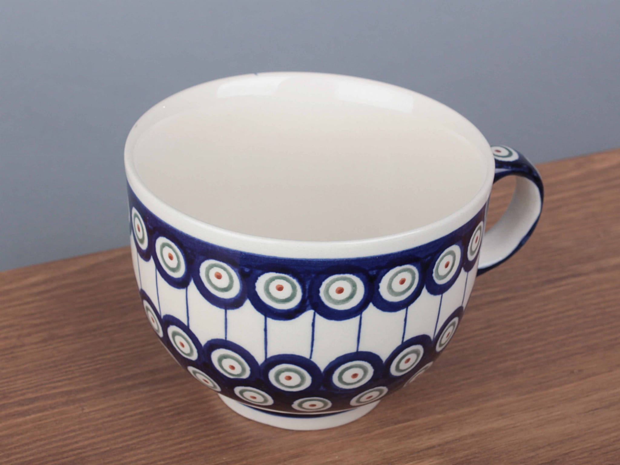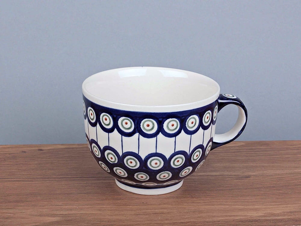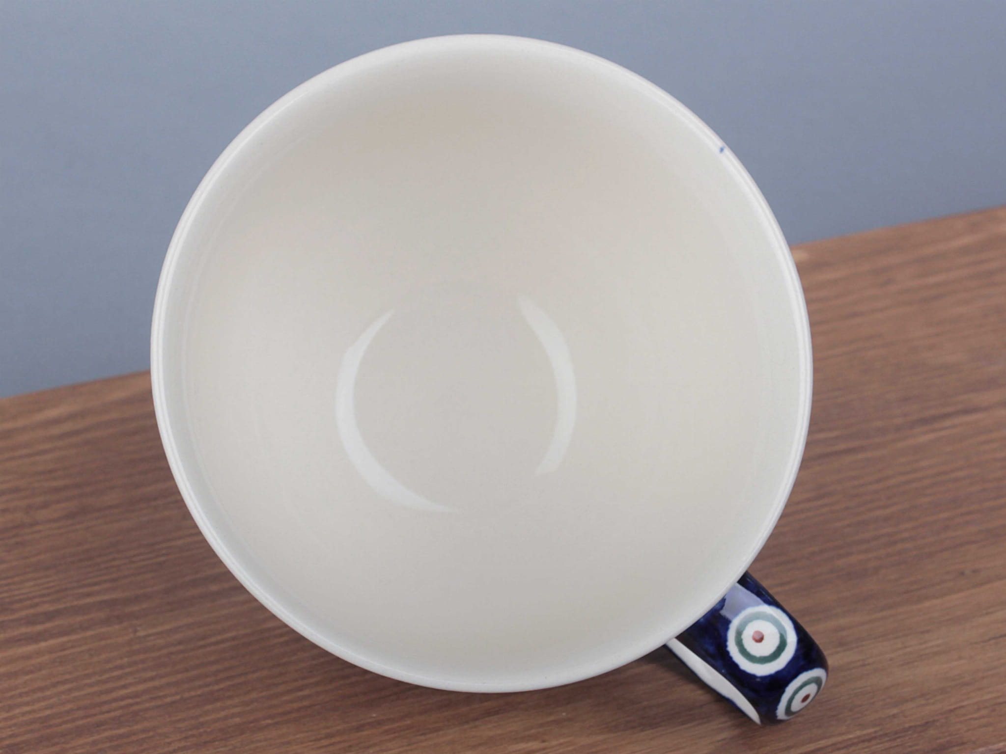 Kubek o pojemności 500 ml, malowany ręcznie. Naczynie do podawania ciepłych i zimnych napojów, kształtem nawiązuje do tradycyjnej filiżanki. Dzięki termoizolacyjnym właściwościom ceramiki zawartość dłużej utrzymuje ciepło. Szkliwienie sprawia, że naczynia są bardziej odporne na zabrudzenia, mają niska absorpcję wody i są łatwiejsze w czyszczeniu.