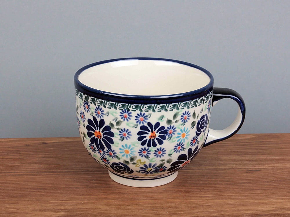 Kubek o pojemności 500 ml, malowany ręcznie. Naczynie do podawania ciepłych oraz zimnych napojów, kształtem nawiązuje do tradycyjnej filiżanki. Dzięki termoizolacyjnym właściwościom ceramiki zawartość dłużej utrzymuje ciepło. Szkliwienie sprawia, że naczynia są bardziej odporne na zabrudzenia, mają niska absorpcję wody i są łatwiejsze w czyszczeniu.