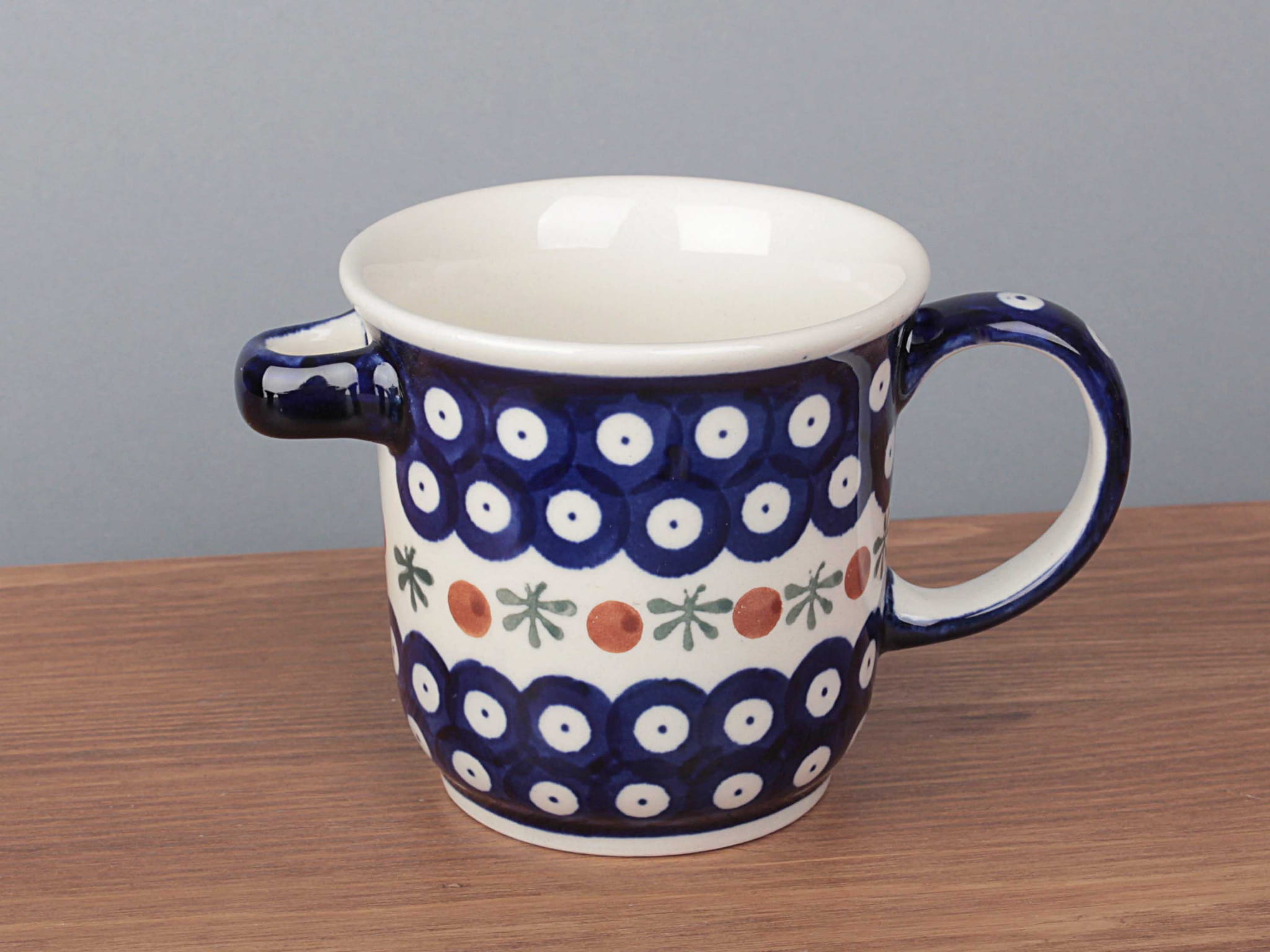 Kubek do zaparzania ziół o pojemności 270 ml, malowany ręcznie. W komplecie kubek, sitko, pokrywka oraz łyżeczka. Dzięki termoizolacyjnym właściwościom ceramiki zawartość dłużej utrzymuje ciepło. Szkliwienie sprawia, że naczynia są bardziej odporne na zabrudzenia, mają niska absorpcję wody i są łatwiejsze w czyszczeniu.