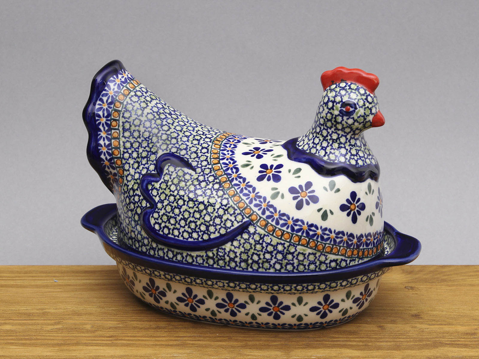 Półmisek w kształcie kury, składający się z dwóch elementów: klosza w kształcie kury i półmiska. Półmisek może być używany do zapiekania i serwowania gorących potraw.