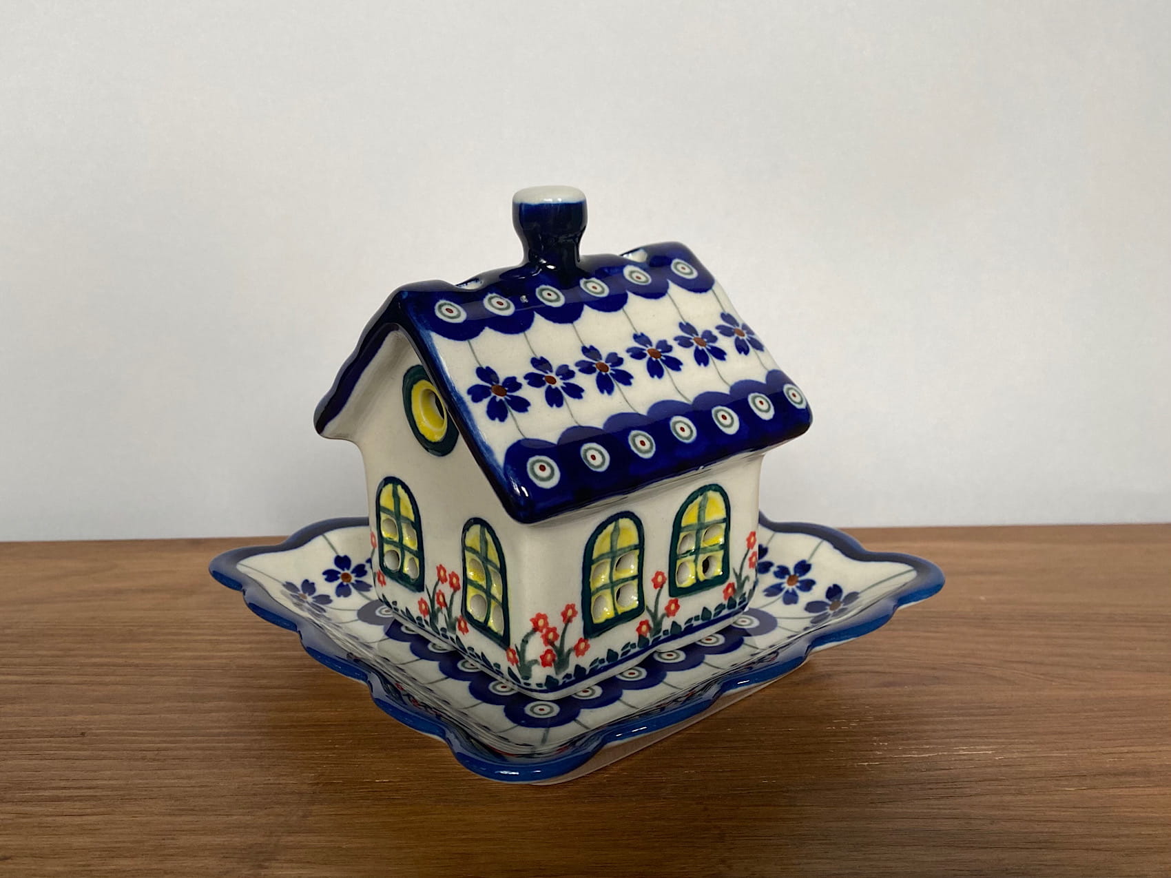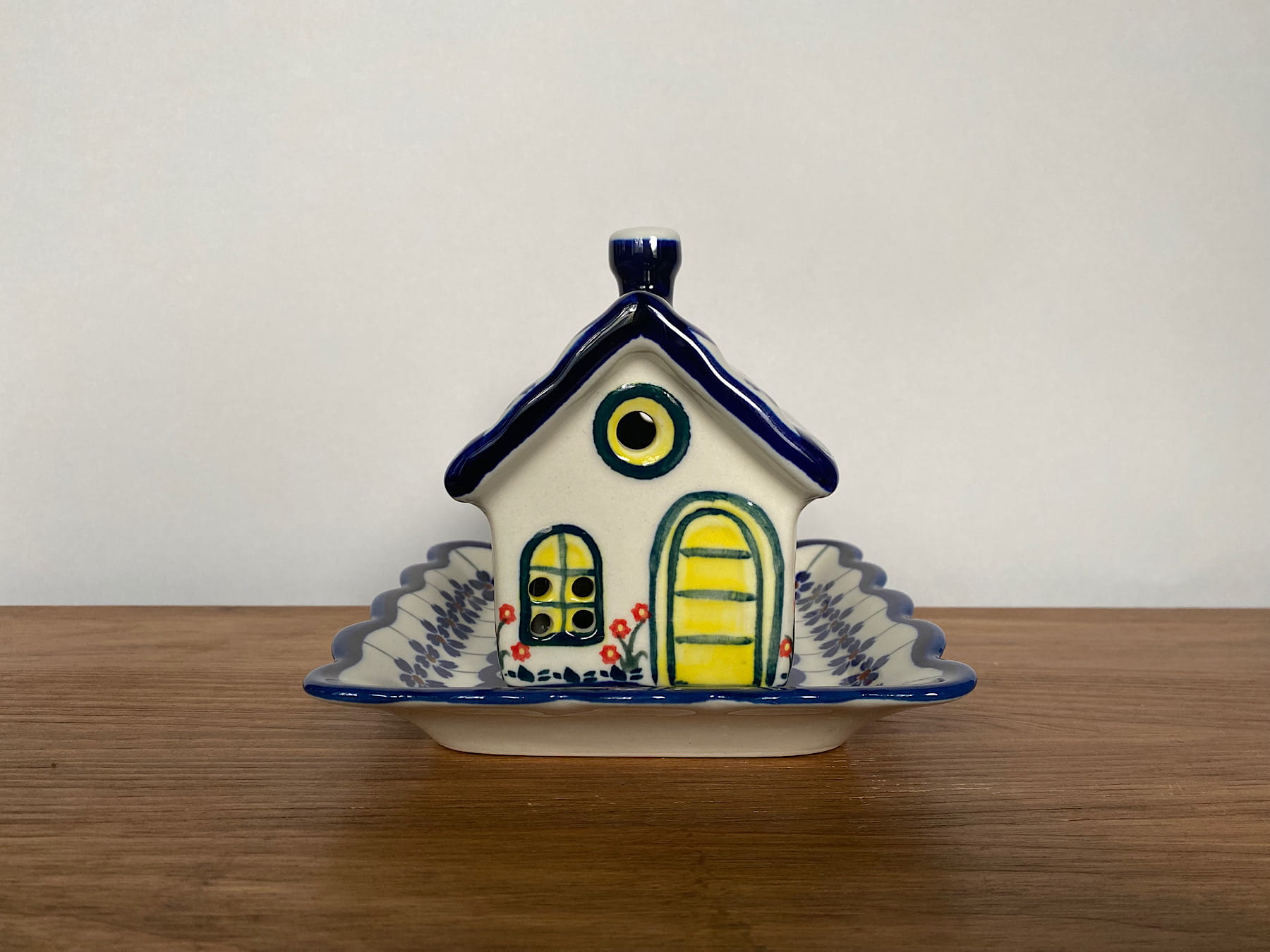 Piękny lampion w kształcie domku wraz z podstawką. W środku domku można zapalić świeczkę. Tworzy niesamowitą atmosferę. Produkt malowany ręcznie. Szkliwienie sprawia, że naczynia są bardziej odporne na zabrudzenia, mają niska absorpcję wody i są łatwiejsze w czyszczeniu.