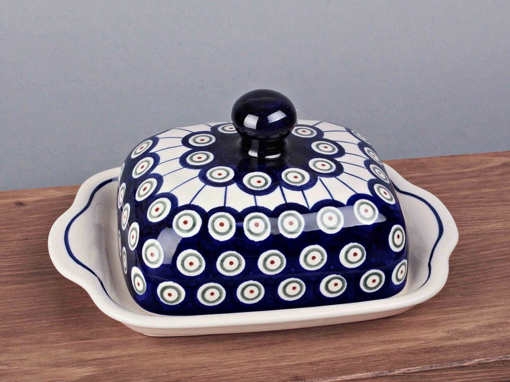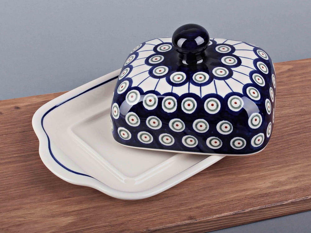 Maselnica z przykrywką na całą kostkę masła, malowana ręcznie. Zachowuje świeżość przechowywanych w niej produktów spożywczych. Szkliwienie sprawia, że naczynia są bardziej odporne na zabrudzenia, mają niska absorpcję wody i są łatwiejsze w czyszczeniu.