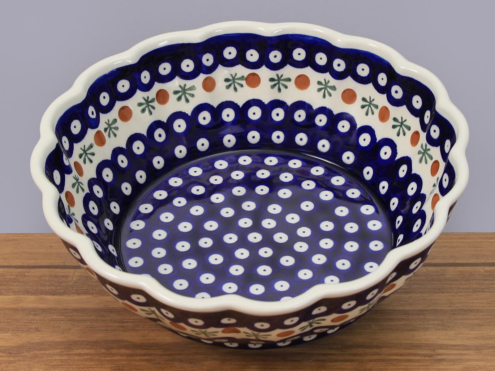 Okrągła miska z falowanymi brzegami o pojemności 1500 ml, malowana ręcznie. Odpowiednia do podawania np. sałatek, owoców, ciepłych potraw. Szkliwienie sprawia, że naczynia są bardziej odporne na zabrudzenia, mają niska absorpcję wody i są łatwiejsze w czyszczeniu.