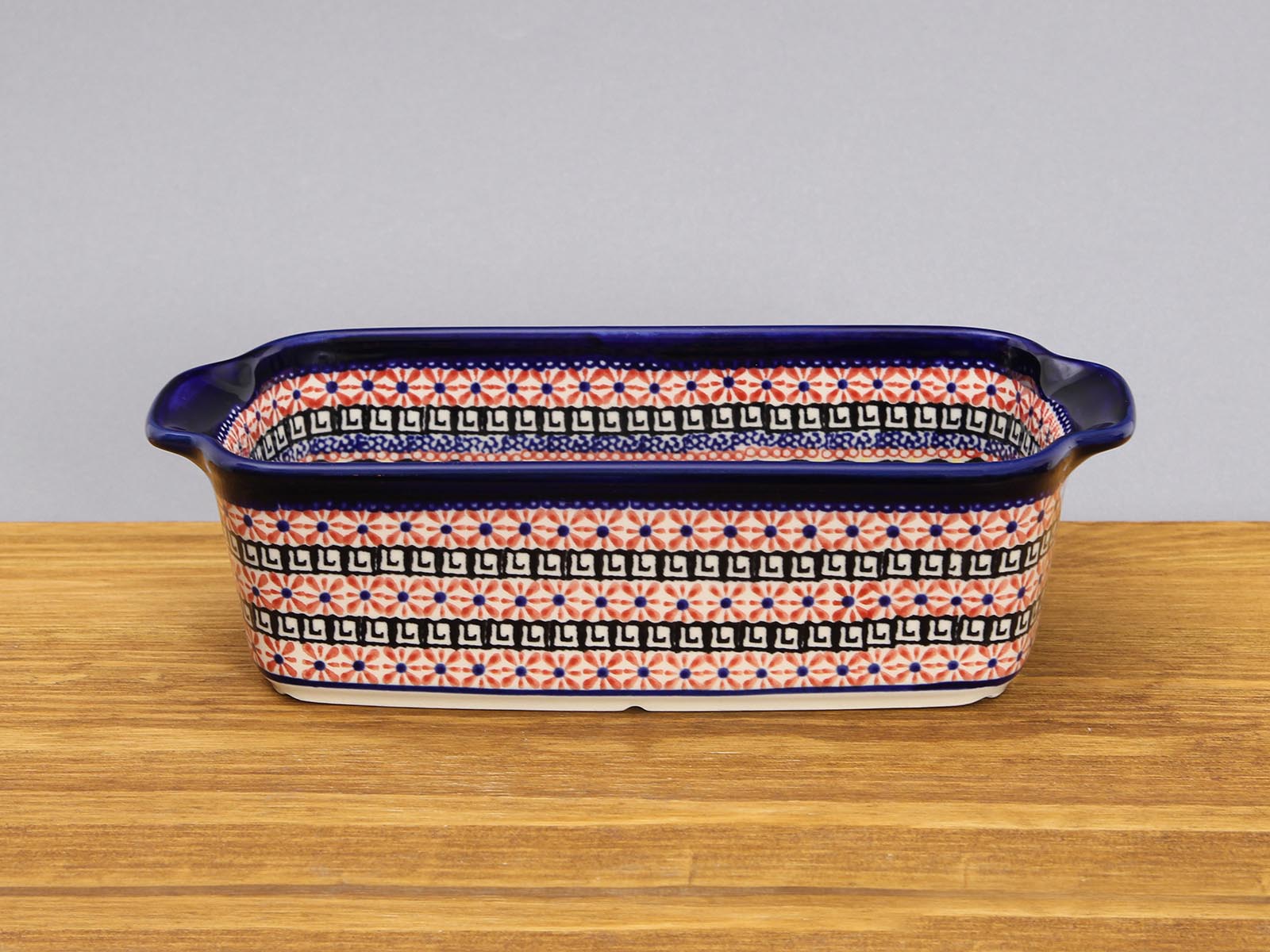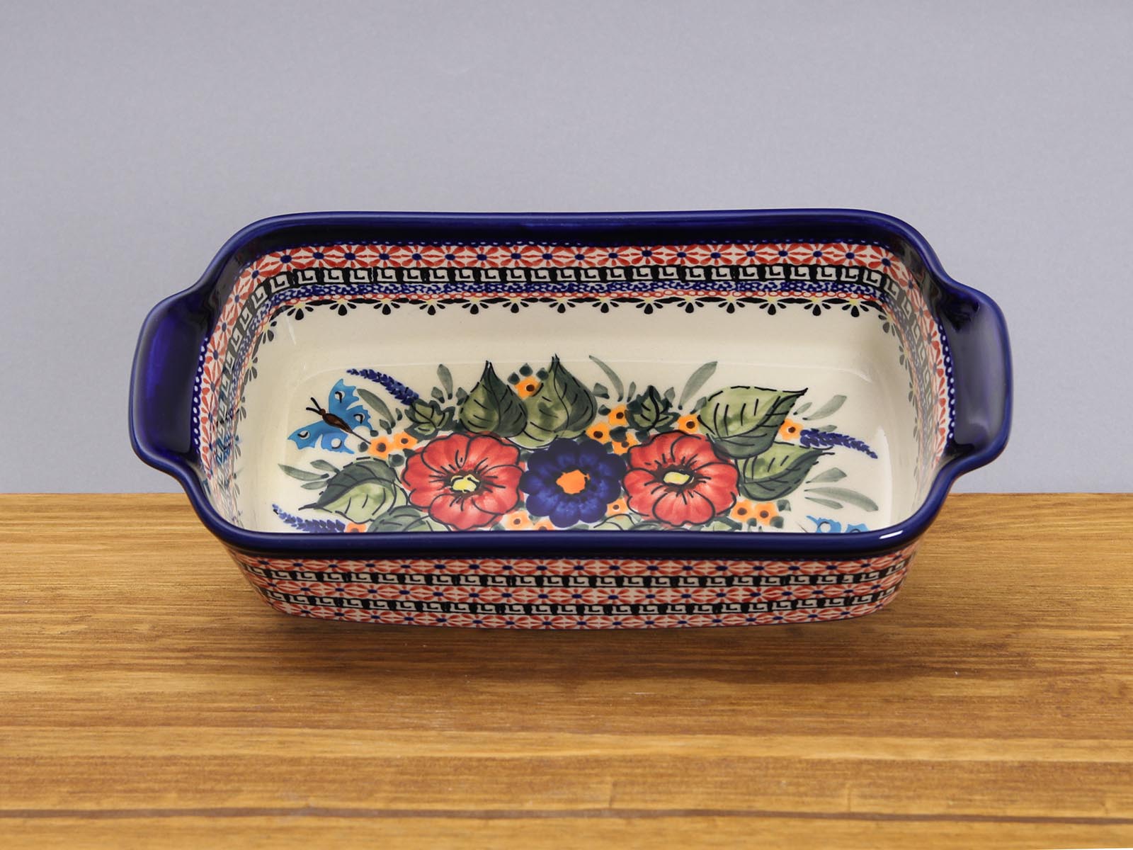 Naczynie do zapiekania z uchwytami o pojemności 1 l, malowane ręcznie. Produkt przystosowany do zapiekania i podgrzewania potraw w temperaturze do 280ºC: w tradycyjnych piekarnikach gazowych i elektrycznych, na płytach szklano-ceramicznych, na elektrycznych płytach stałych. Zasady użytkowania: naczynie wstawiamy do nie nagrzanego piekarnika, nie stawiać gorącego naczynia na zimnym lub mokrym podłożu (najlepiej wykorzystać podkładki), nie użytkować uszkodzonego naczynia, do czyszczenia nie stosować środków żrących ani przedmiotów, które mogą porysować powierzchnię. Szkliwienie sprawia, że naczynia są bardziej odporne na zabrudzenia, mają niska absorpcję wody i są łatwiejsze w czyszczeniu.