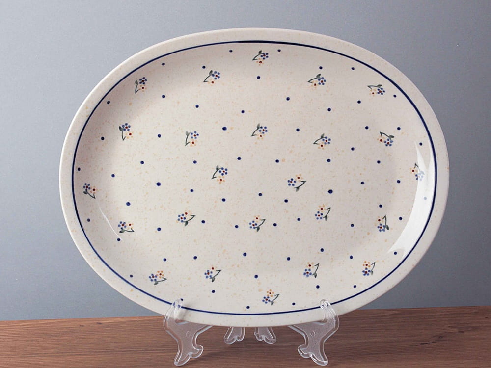 Płaski półmisek o wymiarach 26,7 cm x 34 cm, malowany ręcznie. Produkt przystosowany do zapiekania i podgrzewania potraw w temperaturze do 280ºC: w tradycyjnych piekarnikach gazowych i elektrycznych, na płytach szklano-ceramicznych, na elektrycznych płytach stałych. Zasady użytkowania: naczynie wstawiać do nie nagrzanego piekarnika, nie stawiać gorącego naczynia na zimnym lub mokrym podłożu (najlepiej wykorzystać podkładki), nie użytkować uszkodzonego naczynia, do czyszczenia nie stosować środków żrących ani przedmiotów, które mogą porysować powierzchnię. Szkliwienie sprawia, że naczynia są bardziej odporne na zabrudzenia, mają niska absorpcję wody i są łatwiejsze w czyszczeniu.