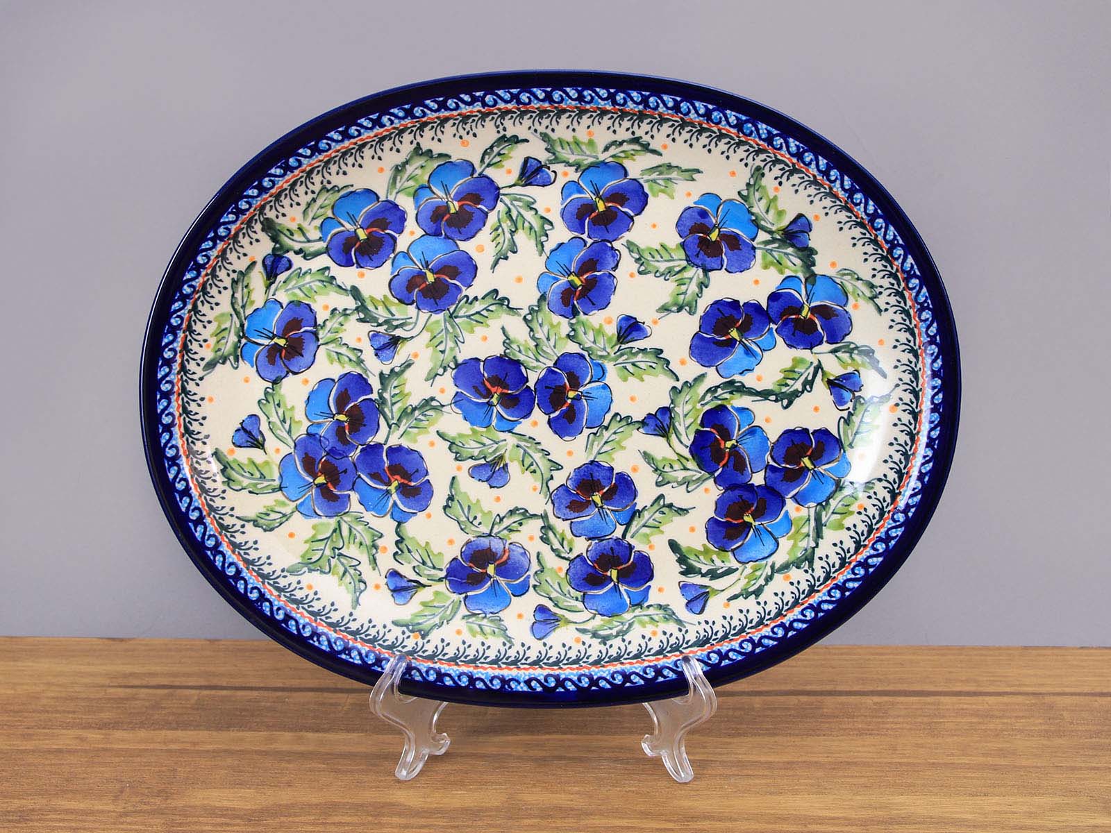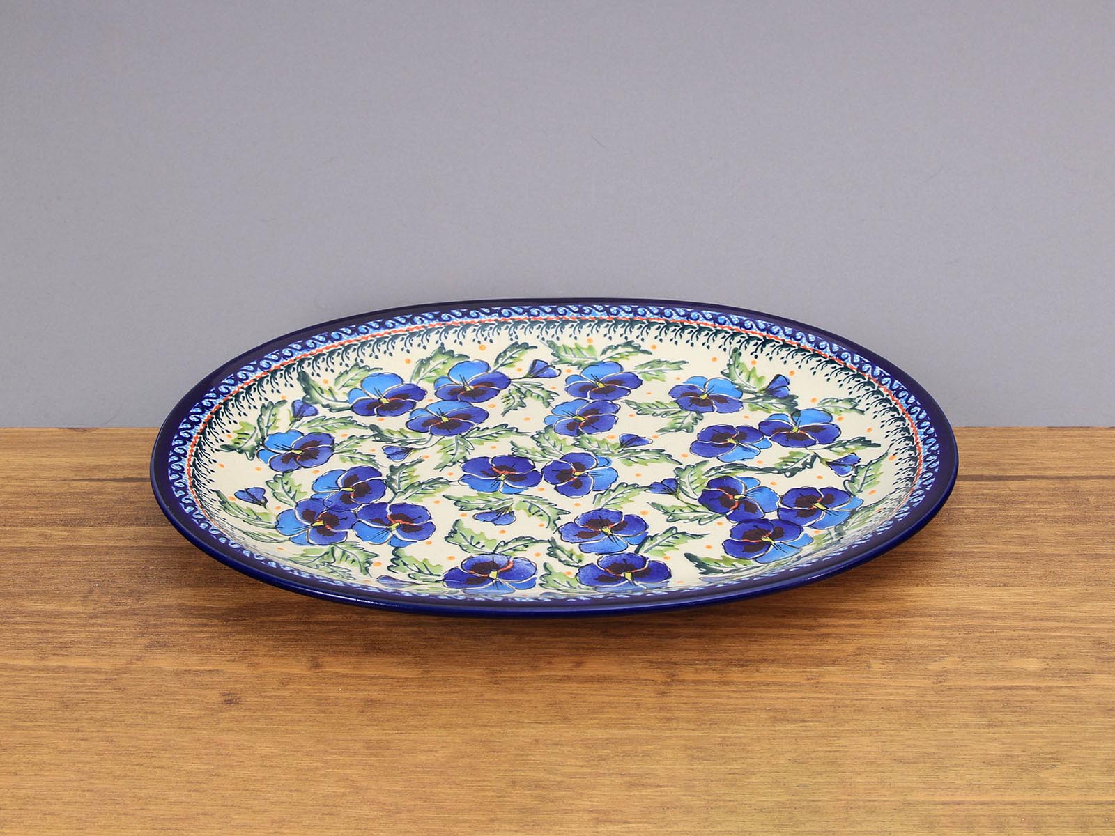 Płaski półmisek do zapiekania o wymiarach 26,7 cm x 34 cm, malowany ręcznie. Produkt przystosowany do zapiekania i podgrzewania potraw w temperaturze do 280ºC: w tradycyjnych piekarnikach gazowych i elektrycznych, na płytach szklano-ceramicznych, na elektrycznych płytach stałych. Zasady użytkowania: naczynie wstawiać do nie nagrzanego piekarnika, nie stawiać gorącego naczynia na zimnym lub mokrym podłożu (najlepiej wykorzystać podkładki), nie użytkować uszkodzonego naczynia, do czyszczenia nie stosować środków żrących ani przedmiotów, które mogą porysować powierzchnię. Szkliwienie sprawia, że naczynia są bardziej odporne na zabrudzenia, mają niska absorpcję wody i są łatwiejsze w czyszczeniu.