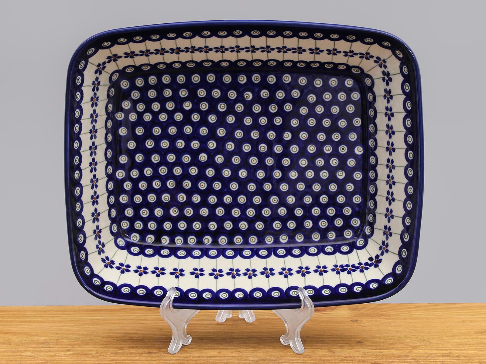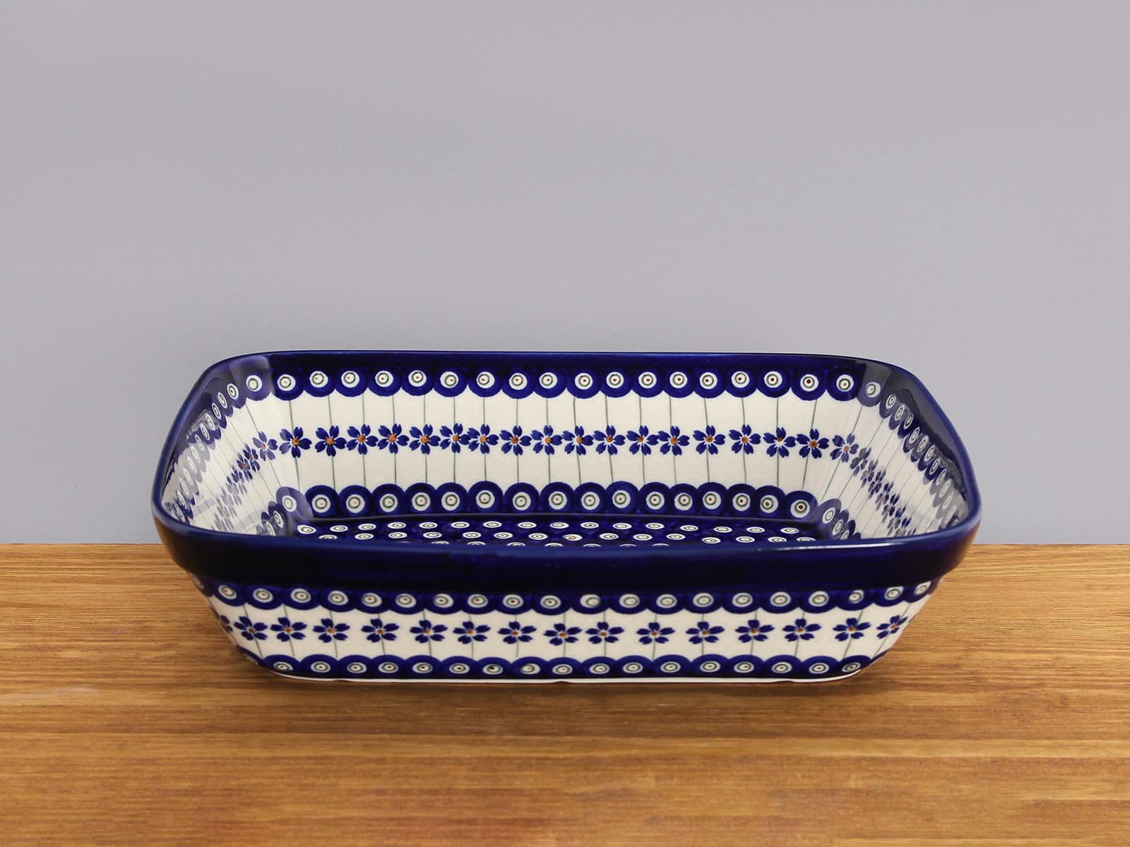 Prostokątne naczynie do zapiekania i podgrzewania o wymiarach 24,7 cm x 30,6 cm, malowane ręcznie. Produkt przystosowany do zapiekania i podgrzewania potraw w temperaturze do 280ºC: w tradycyjnych piekarnikach gazowych i elektrycznych, na płytach szklano-ceramicznych, na elektrycznych płytach stałych. Zasady użytkowania: naczynie wstawiać do nie nagrzanego piekarnika, nie stawiać gorącego naczynia na zimnym lub mokrym podłożu (najlepiej wykorzystać podkładki), nie użytkować uszkodzonego naczynia, do czyszczenia nie stosować środków żrących ani przedmiotów, które mogą porysować powierzchnię. Szkliwienie sprawia, że naczynia są bardziej odporne na zabrudzenia, mają niska absorpcje wody i są łatwiejsze w czyszczeniu.