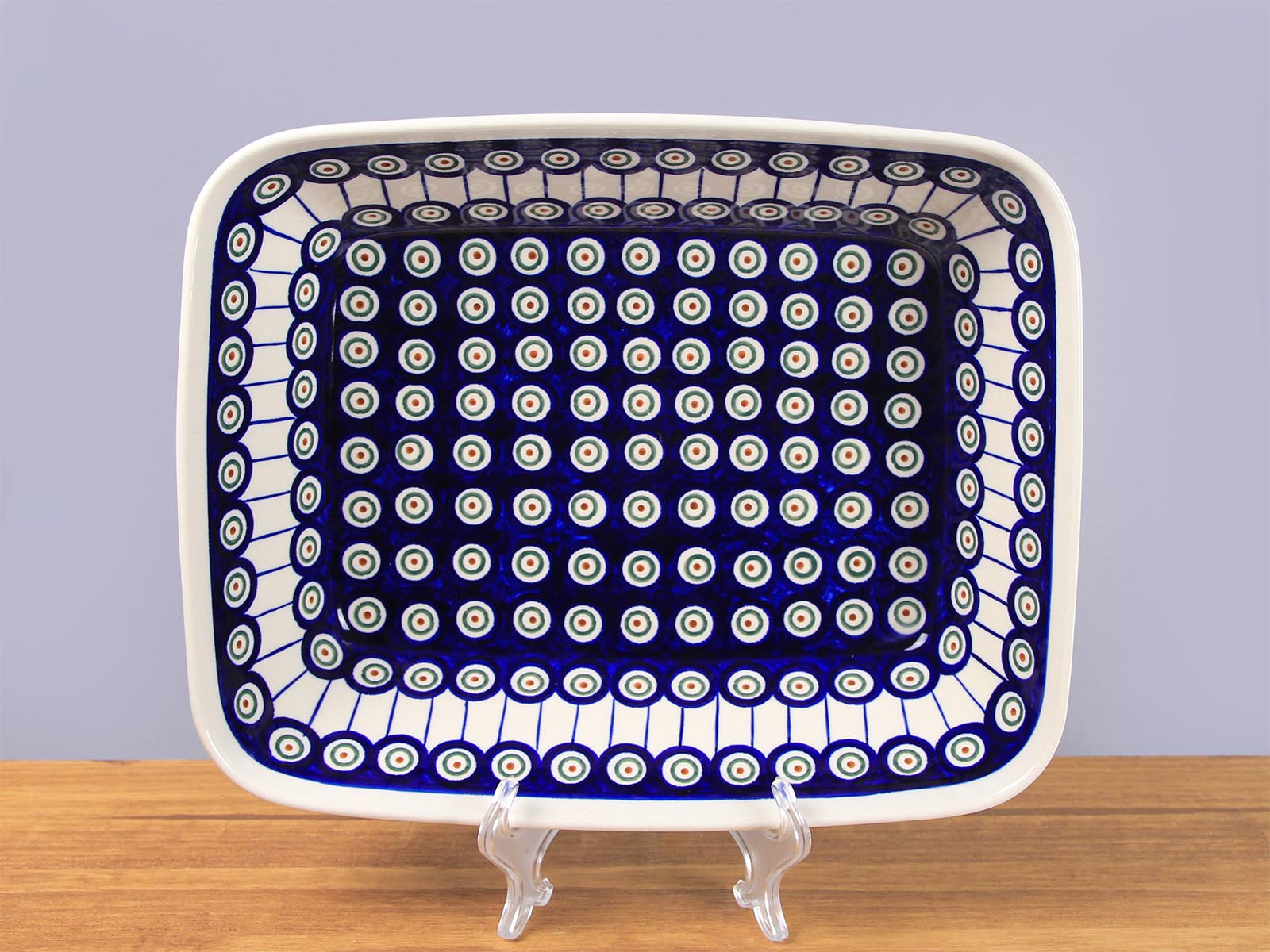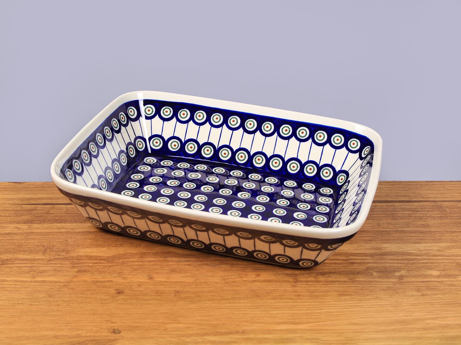 Prostokątne naczynie do zapiekania i podgrzewania o wymiarach 24,7 cm x 30,6 cm, malowane ręcznie. Produkt przystosowany do zapiekania i podgrzewania potraw w temperaturze do 280ºC: w tradycyjnych piekarnikach gazowych i elektrycznych, na płytach szklano-ceramicznych, na elektrycznych płytach stałych. Zasady użytkowania: naczynie wstawiać do nie nagrzanego piekarnika, nie stawiać gorącego naczynia na zimnym lub mokrym podłożu (najlepiej wykorzystać podkładki), nie użytkować uszkodzonego naczynia, do czyszczenia nie stosować środków żrących ani przedmiotów, które mogą porysować powierzchnię. Szkliwienie sprawia, że naczynia są bardziej odporne na zabrudzenia, mają niska absorpcję wody i są łatwiejsze w czyszczeniu.