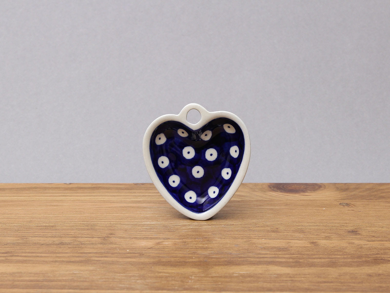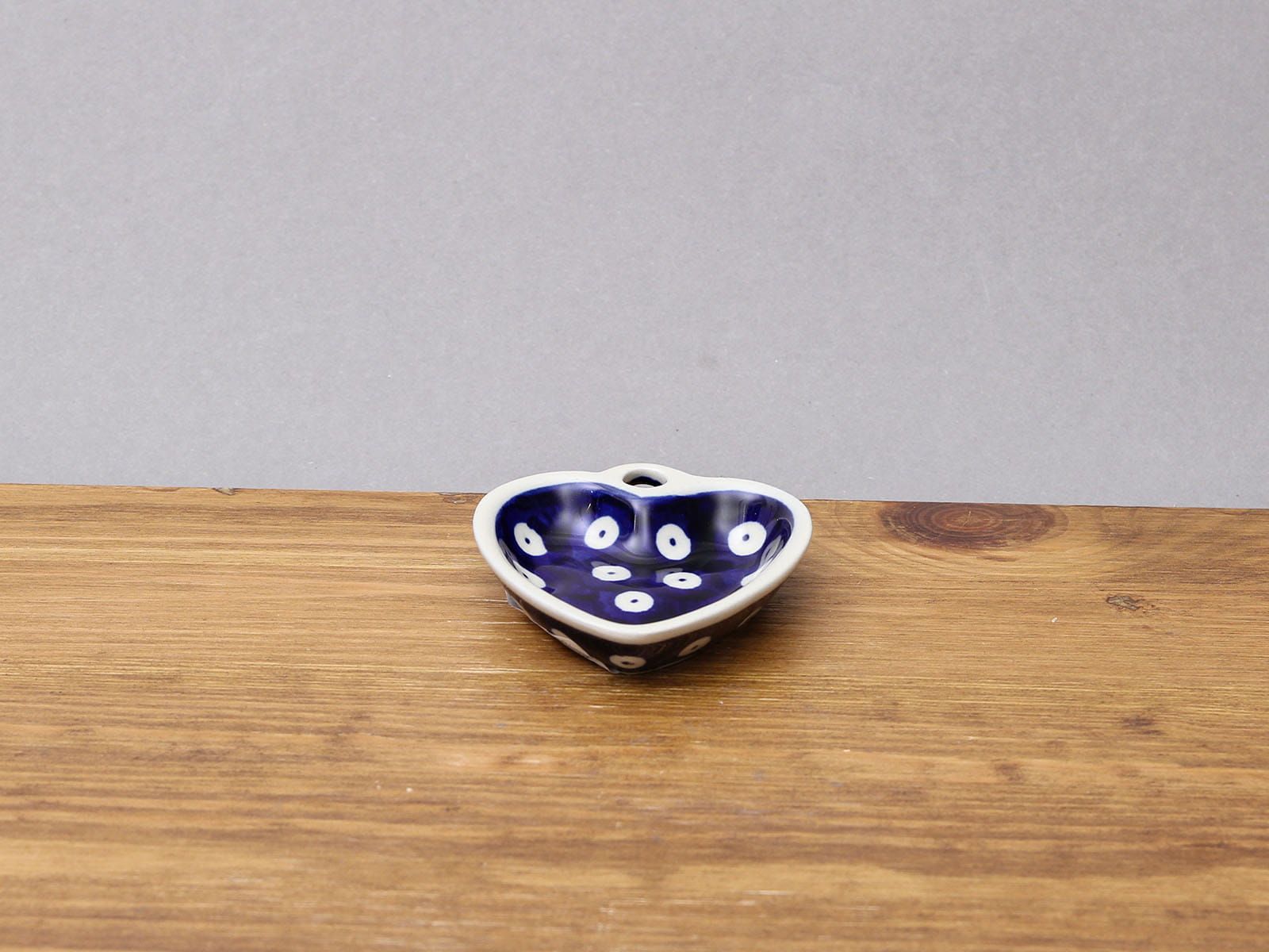Mała podstawka w kształcie serca z uchwytem, malowana ręcznie. Może służyć jako podstawka do podawania przypraw, dipów, odłożenia torebki po herbacie lub jako dekoracja. Posiada mały uchwyt, który umożliwia powieszenie jej na ścianie. Szkliwienie sprawia, że produkty są bardziej odporne na zabrudzenia, mają niską absorpcję wody i są łatwiejsze w czyszczeniu.