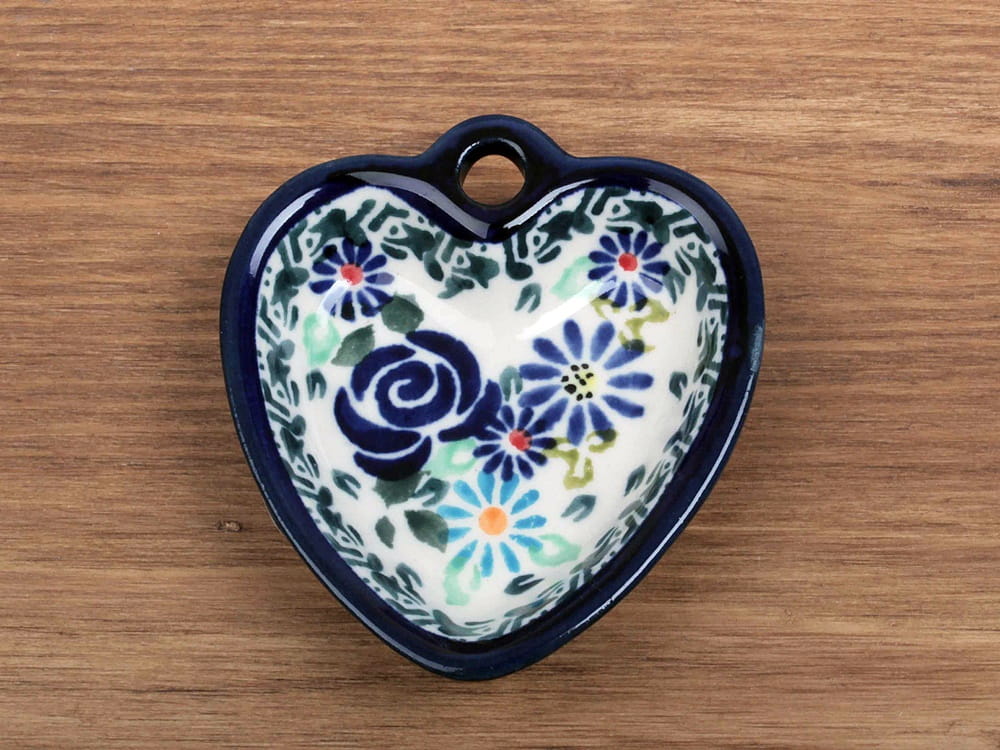Mała podstawka w kształcie serca z uchwytem, malowana ręcznie. Może służyć jako podstawka do podawania przypraw, dipów, odłożenia torebki po herbacie lub jako dekoracja. Posiada mały uchwyt, który umożliwia powieszenie jej na ścianie. Szkliwienie sprawia, że produkty są bardziej odporne na zabrudzenia, mają niską absorpcję wody i są łatwiejsze w czyszczeniu.