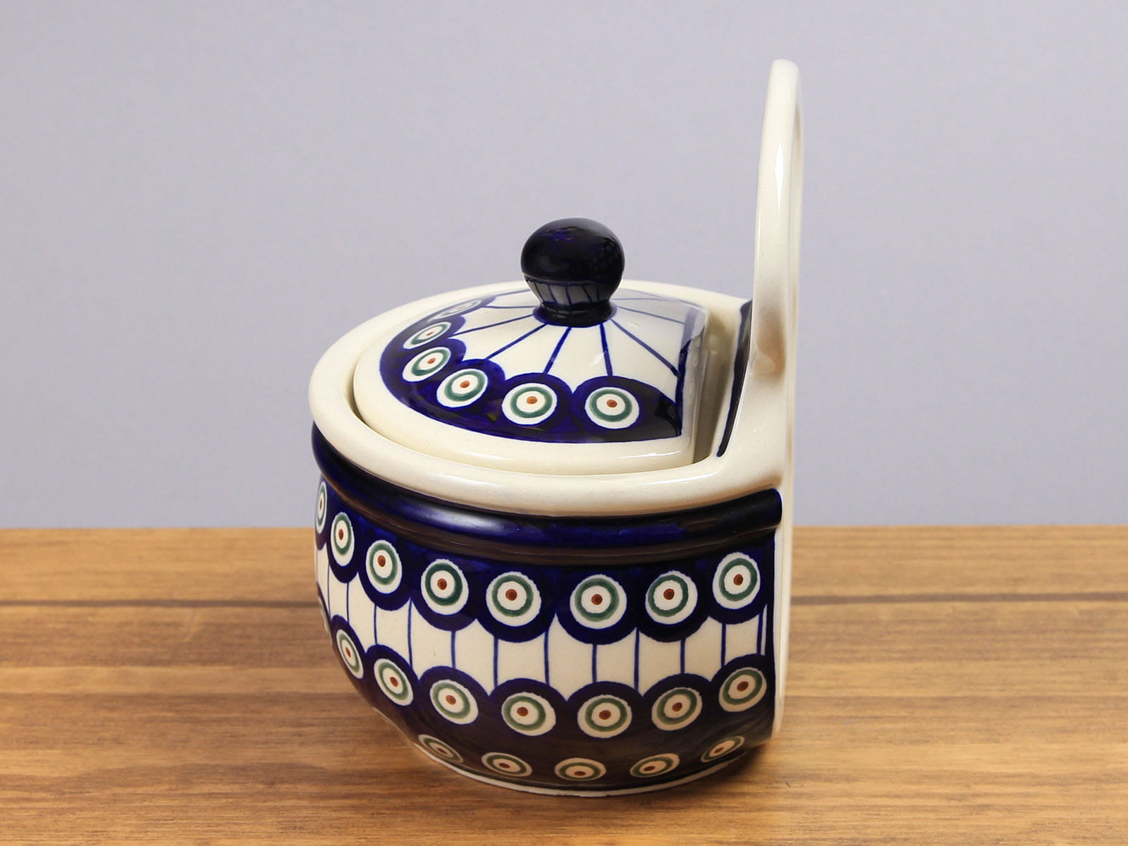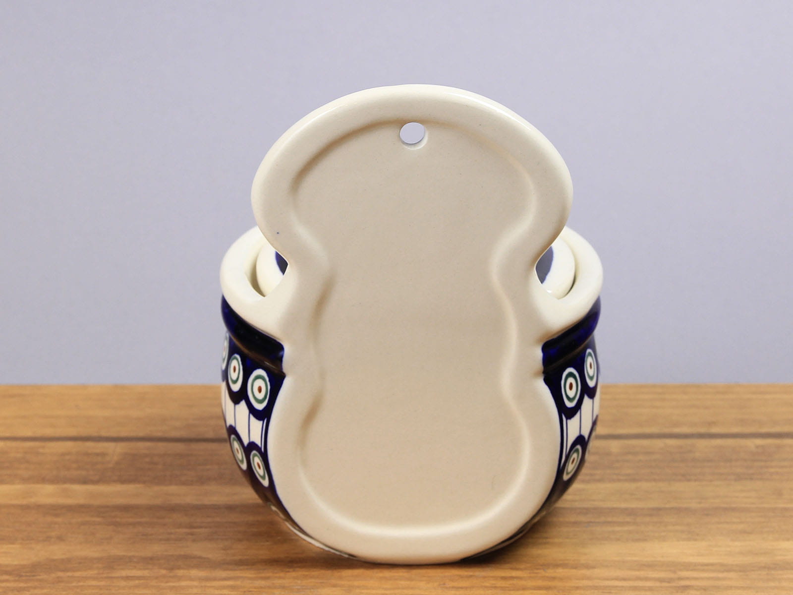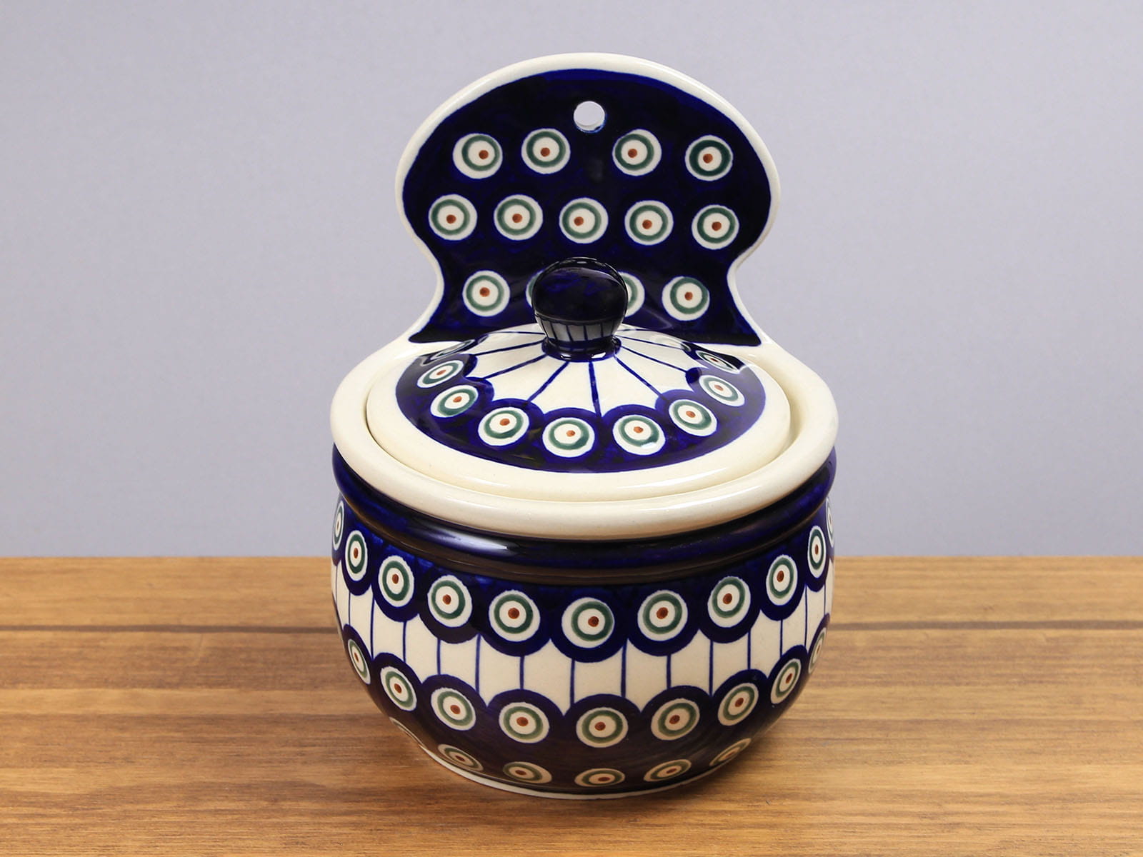 Pojemnik z przykrywką o pojemności 700 ml, malowany ręcznie. Odpowiedni do przechowywania np. bułki tartej, cukru, słodyczy, soli. Posiada dziurkę umożliwiającą powieszenie pojemnika na ścianie. Szkliwienie sprawia, że naczynia są bardziej odporne na zabrudzenia, mają niska absorpcję wody i są łatwiejsze w czyszczeniu.