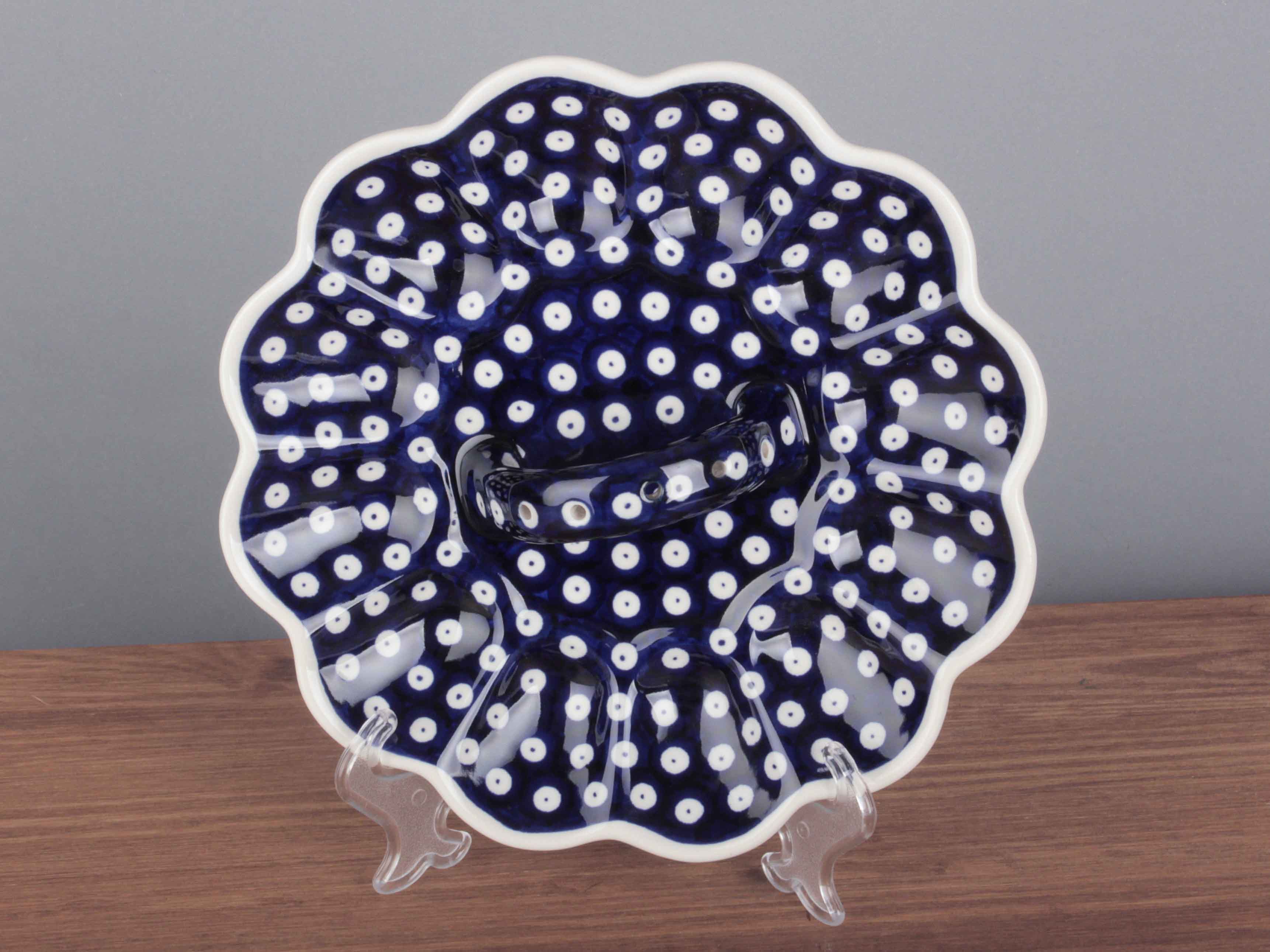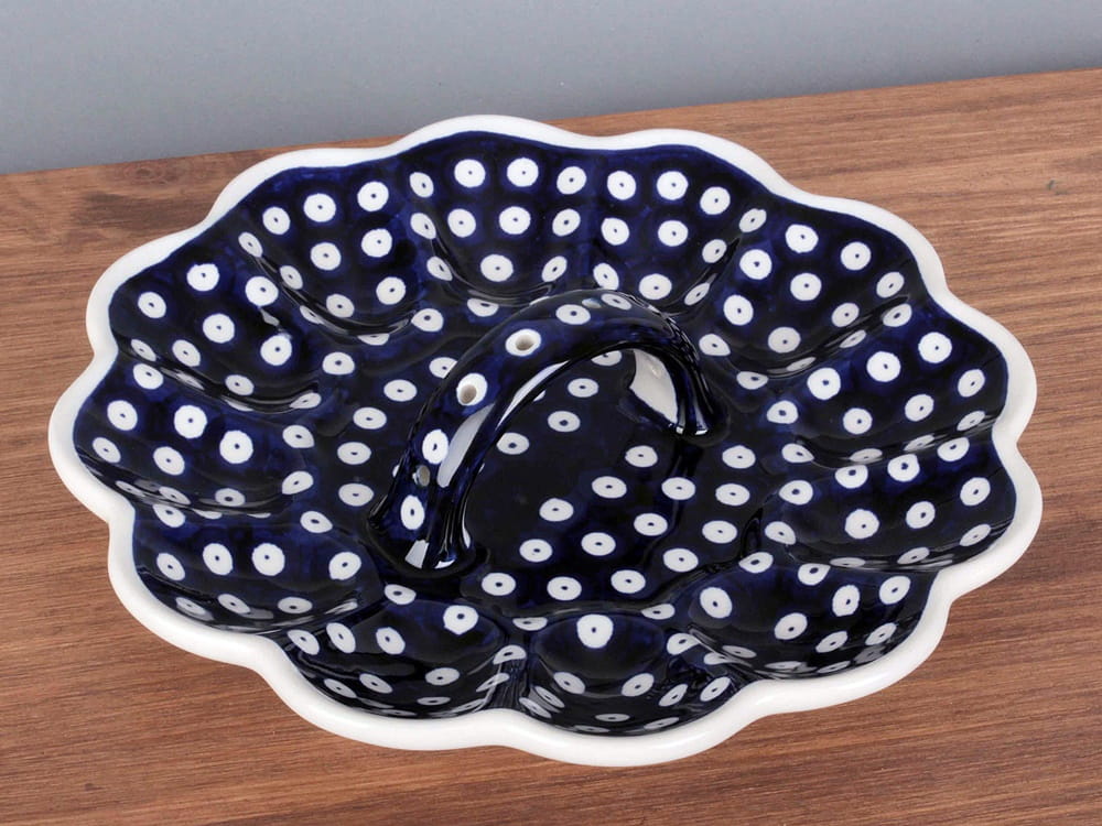 Talerz na jajka z uchwytem, malowany ręcznie. To dobry pomysł na ładnie podane jajka czy to w skorupkach czy też obrane, przekrojone na połówki i przybrane lub wykorzystać do podania jajek faszerowanych. Szczególnie przydatny podczas Świąt Wielkanocnych. Szkliwienie sprawia, że naczynia są bardziej odporne na zabrudzenia, mają niska absorpcję wody i są łatwiejsze w czyszczeniu.